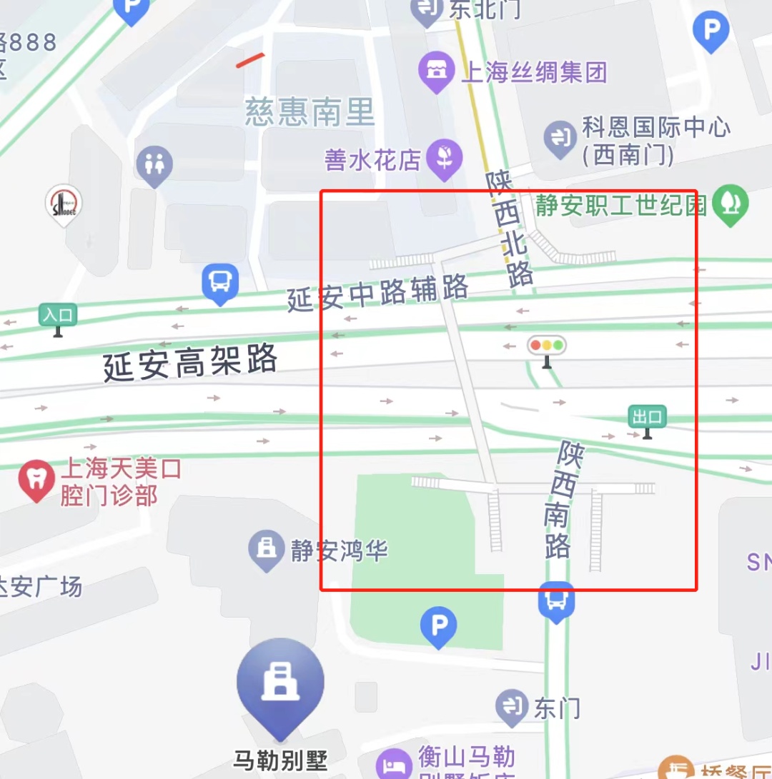 从陕西路延安路人行天桥向下望去,可以俯瞰马勒别墅,连前面的花园也可以看到,是欣赏马勒别墅的好位置。