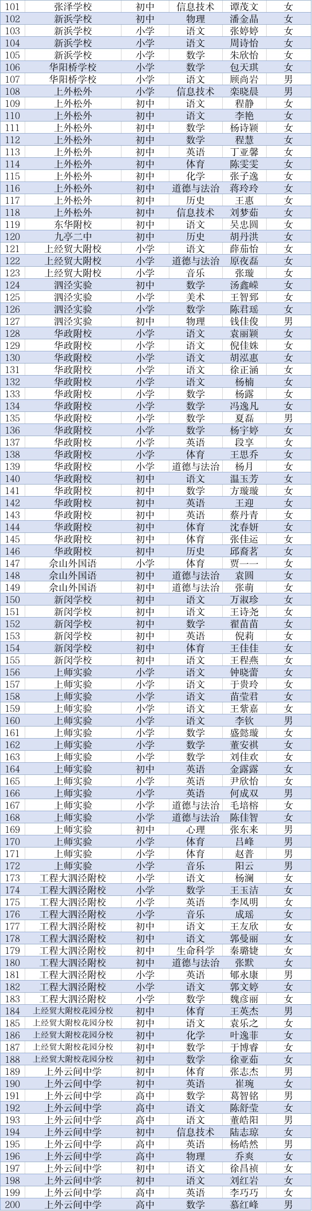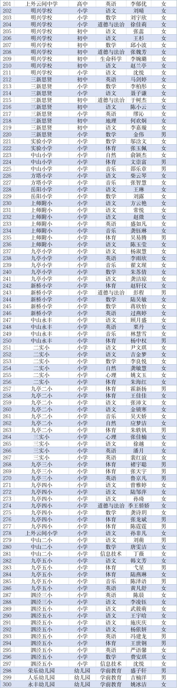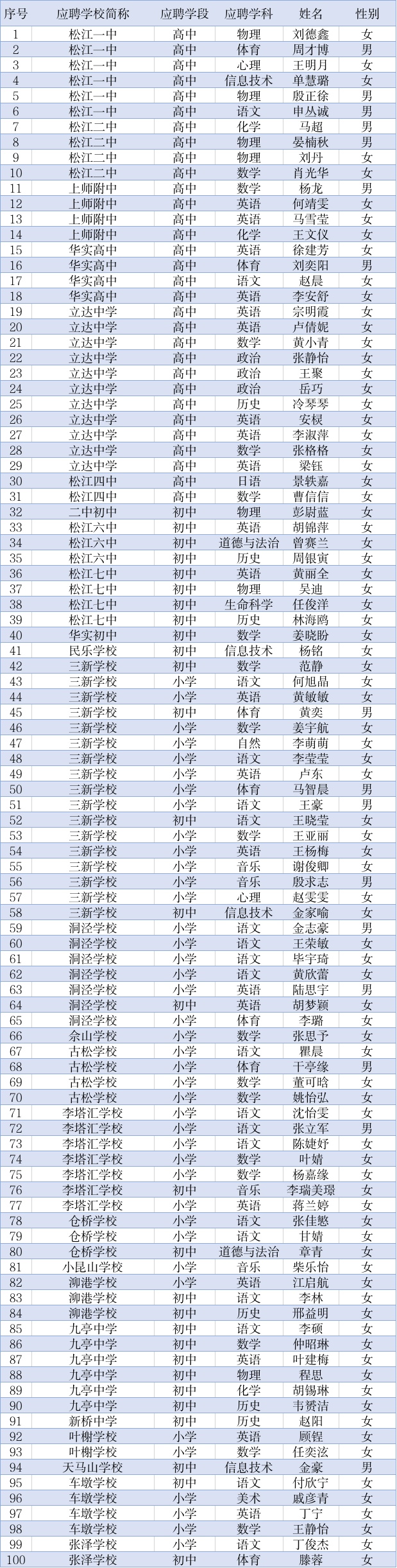 在相关学校对应聘人员进行材料审核、课堂教育教学能力测试的基础上,区教育党群和人才服务中心对各校上报的应聘人员开展了区级综合素质测试,内容包括学科专业知识测试、面试以及心理调适能力测试,以下应聘人员通过了区级综合素质测试。相关学校将根据需要在以下人员中择优录用,并收齐拟录用人员的体检合格证明材料(二级及以上医院开具)和政审合格材料。