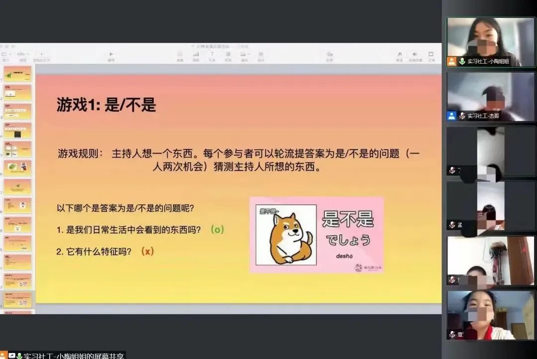 活动中,热身游戏“是不是”让欢快的气氛在线上“弥漫”。孩子们提出各种问题,通过出题者回答的“是”或“不是”来缩小问题的范围,从而找到出题者预设的答案。大家一边仔细倾听别人的提问,一边开动脑筋、积极发问,很快便投入到此次活动中来。