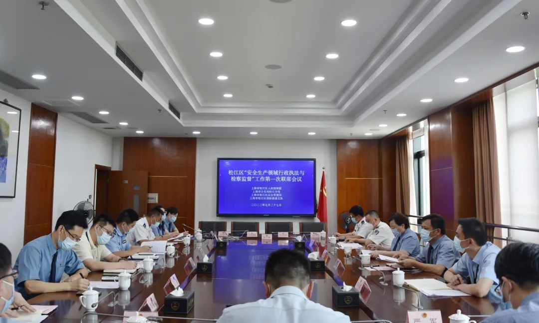 为进一步强化安全生产监管合力,7月27日下午,由松江区检察院牵头,与区公安分局、区应急管理局、区消防救援支队签订了《关于建立安全生产领域行政执法与检察监督联动机制的意见》,并召开了第一次联席会议,各成员单位领导及业务部门负责人出席。