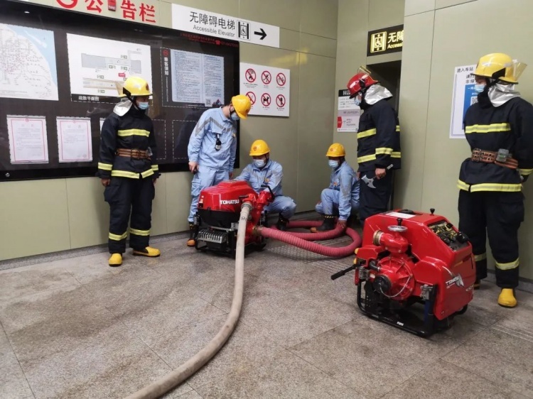 由于雨势加大,积水增加,车站对防汛物资需求量不断加大。为确保现场防汛抢险工作顺利进行,下沙站还启动了18号线应急物资平移支援机制,提前向线路防汛物资储备点沈梅路站申请物资和应急人员平移支援。同时,地铁消防人员操作排水泵开始抽水。