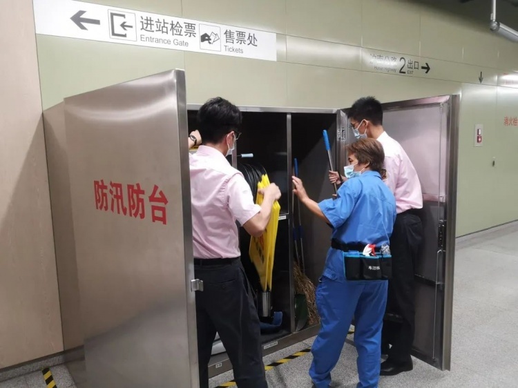 7月27日下午14时,地铁18号线下沙站工作人员的对讲机中响起了急促的指令声,工作人员迅速取出防汛物资应急储备点的沙袋、阻水袋等,运送到2号口,并在2号口安装了2块防汛板。由于水位持续上升,车站将2号口关闭,引导乘客从其他出入口进出。