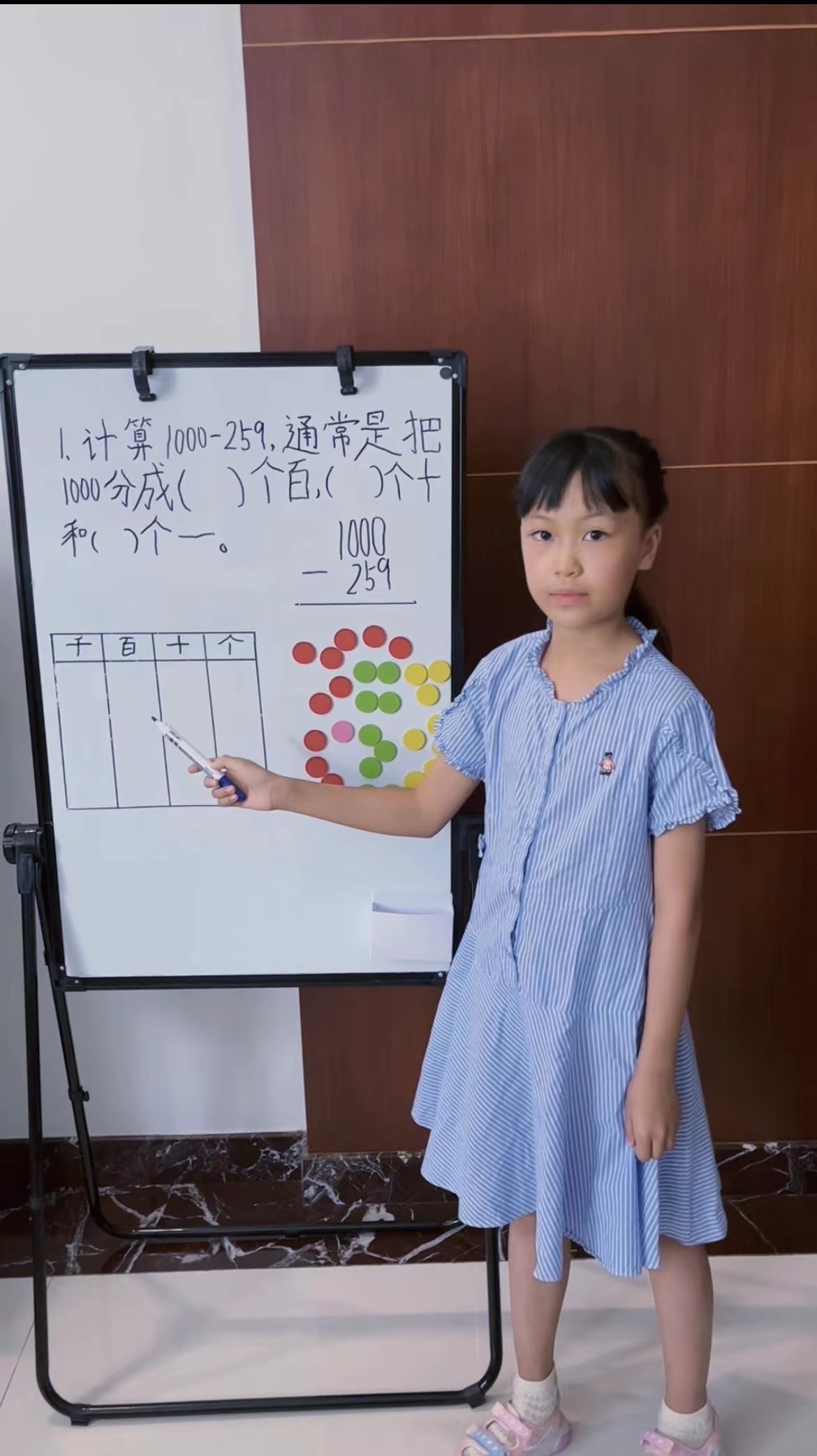 靠墙支起小黑板,手持水写笔,视频中,二(1)班学生李芃希神态自然,借助颜色各异的小圆片清晰流畅地讲解了“1000-259”的算题思路,俨然一名“资深小讲师”。李芃希妈妈介绍,女儿确实是一名“身经百战”的数学“小讲师”了,刚读一年级时便在数学老师指导下尝试讲解题目。一开始比较羞涩,即便心里清楚解题思路,也表达不出来,一年过去了,孩子在语言表达和逻辑思维上都有明显进步,从害怕学数学变为喜欢学数学,甚至还有了“长大想当数学老师”的理想。“‘小讲师’活动给了孩子锻炼的平台,孩子们在一次次讲解中增强了自信心。”李芃希妈妈说。