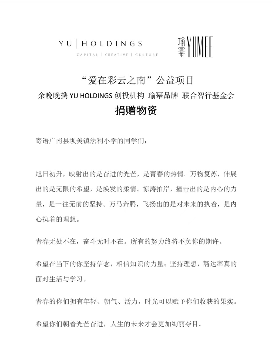 近日,一批价值34.34万元的爱心捐赠物资抵达云南省文山州广南县坝美镇法利完小。据悉,此次捐赠得到了余晚晚女士、YU HOLDINGS创投机构、瑜幂品牌、智行基金会、The Northface的大力支持,大家积极响应石门二路街道社区党委的号召,克服疫情影响,及时将捐赠物品快递到云南文山。