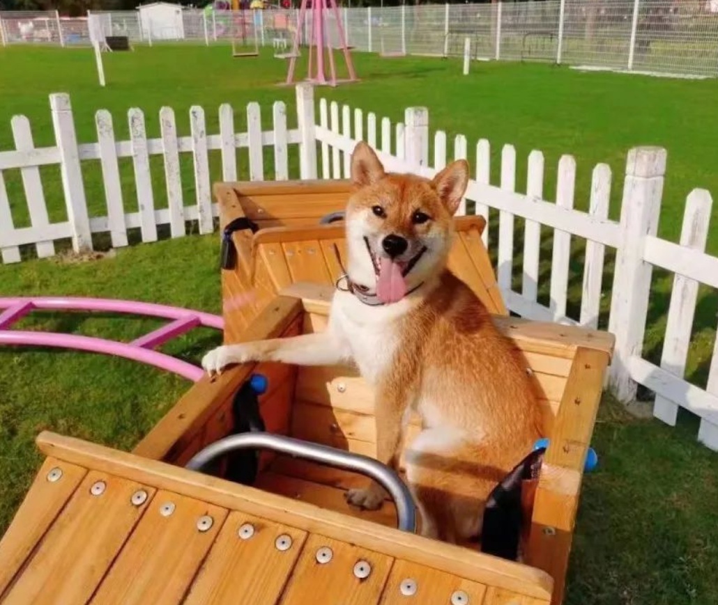 这里有近20000平方米的真草草坪,分成了六大区域。其中设有缓冲区,可以让狗狗适应环境。游乐场中间还放置了狗狗的游玩设备:宠物摩天轮、人力过山车、旋转秋千等。