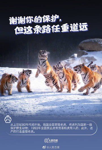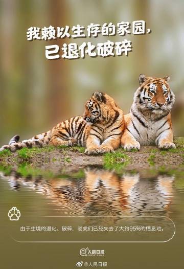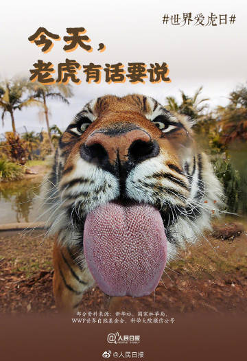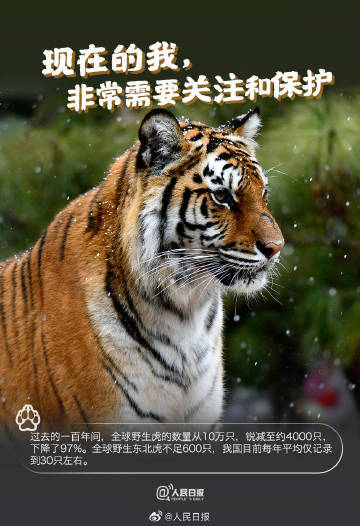 它是“百兽之王”,是威风的猎手;它曾有许多“兄弟姐妹”,却再也无法相见。过去一百年间,全球野生虎的数量从10万只锐减至约4000只,下降了97%。我国将虎列为国家一级保护野生动物,今天世界爱虎日,拒绝野生动物制品,拒绝动物表演!