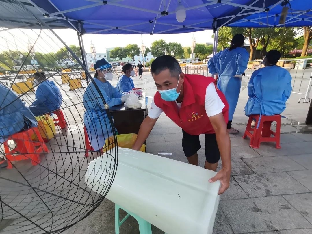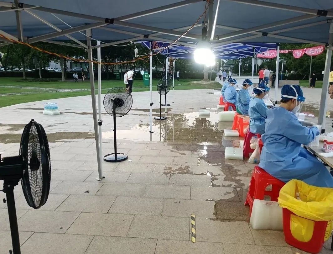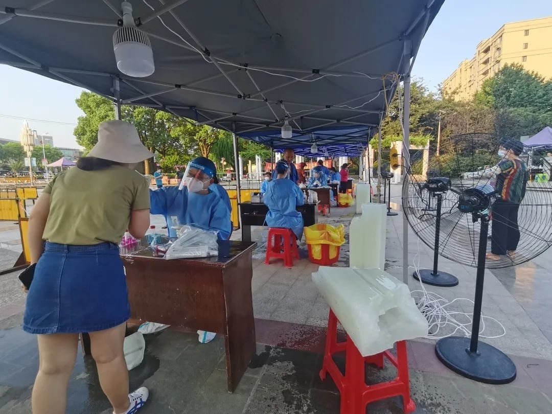 由于每个采样点位的情况不同,吕巷镇蟠桃广场、车镜广场等室外点位没办法转移到室内,尽管有遮阳大棚,但还是难抵高温热浪。为了降温,吕巷镇疫情防控物资保障组通过工业开发总公司,联系到了区内的一家企业,采购了一批大冰块。“我们今天送了大概60块,主要配送至室外的采样点位,基本上一个工位配一块。”物资保障组相关负责人说。