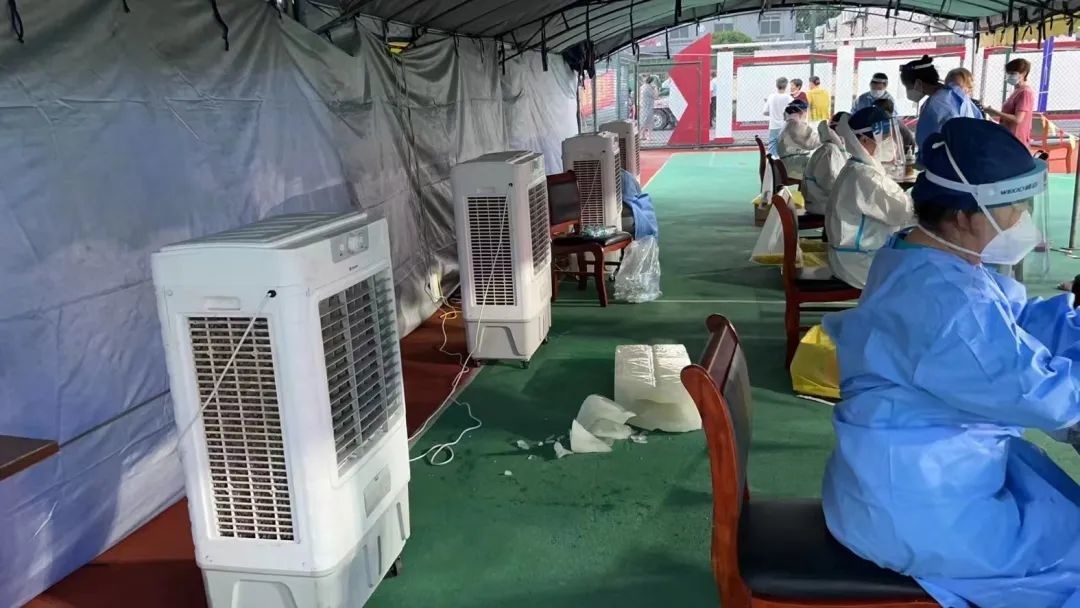 姚家村、夹漏村、蔷薇村、马新村等不少村,将核酸采样点位搬进了“空调房”,这些“空调房”有的是村委会的办公室,有的是会议室,医护人员和志愿者们在“空调房”中开展工作,减轻了不少身体负担。