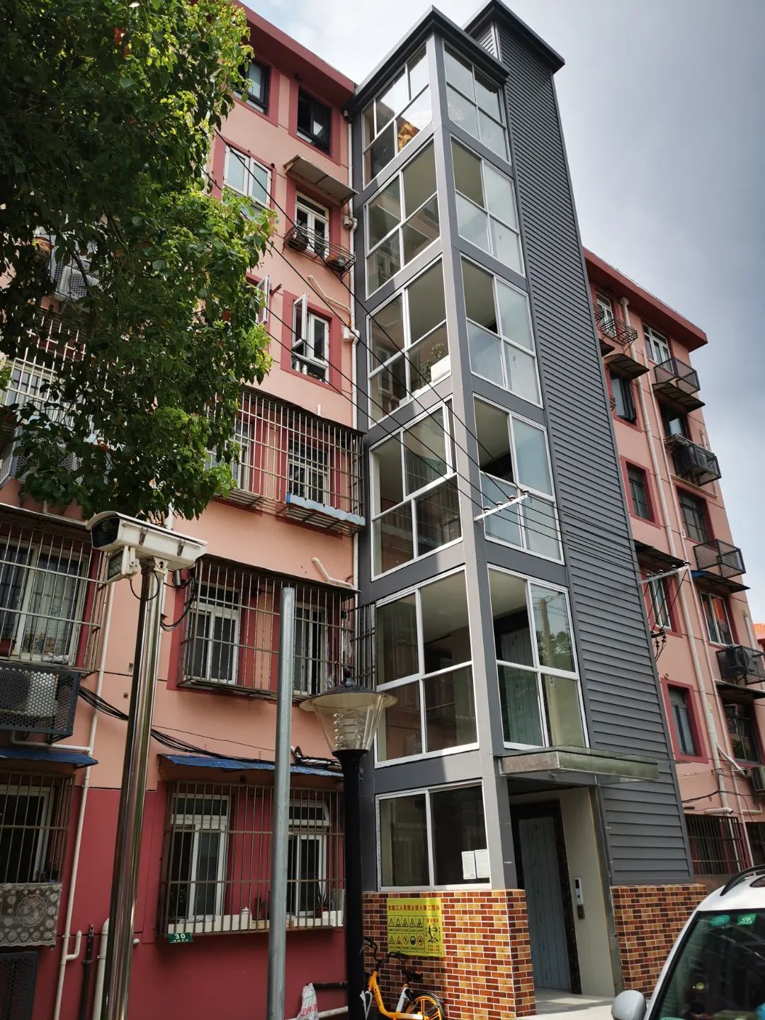 目前,30号楼电梯加装工程已经竣工,进入验收阶段。电梯设6层5站,通过连廊半层入户,外部贴装灰色铝单板,十分美观大方。电梯连廊两侧设有窗户,有利于通风采光,顶部装有LED廊灯,地面铺设灰色地砖,内部装修风格简洁明亮。从申请到竣工,除去春节假期及疫情影响的时间,实际只用了9个月。