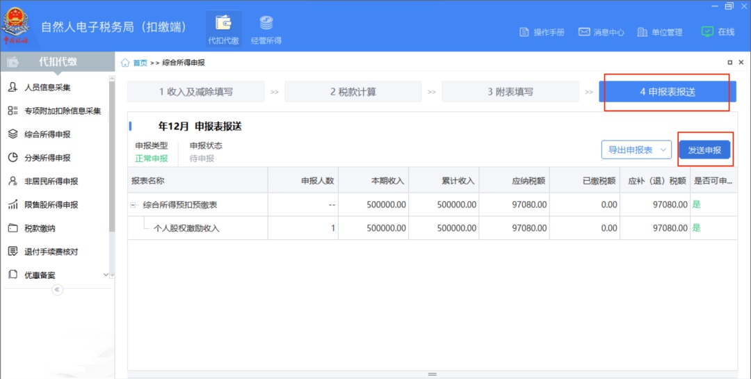 第五步:申报表填写完整后点击【申报表报送】、【发送申报】,完成申报。