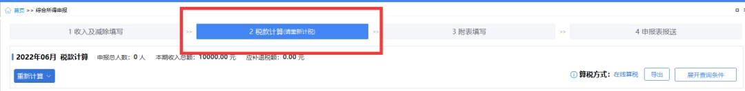 第四步:点击【返回】,点击【税款计算】,系统会自动计算税额。