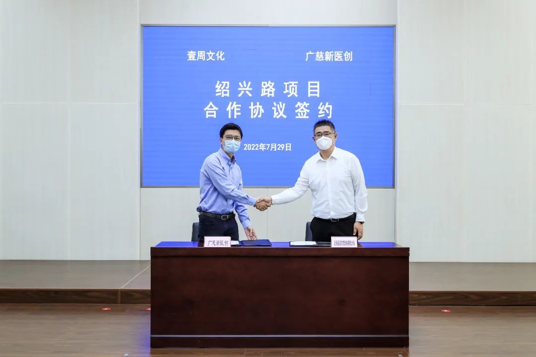 仪式上,世纪出版集团旗下“壹周文化”执行董事李磊和广慈“新医创”董事长林靖生就“绍兴路相关载体的更新改造”签订合作协议。