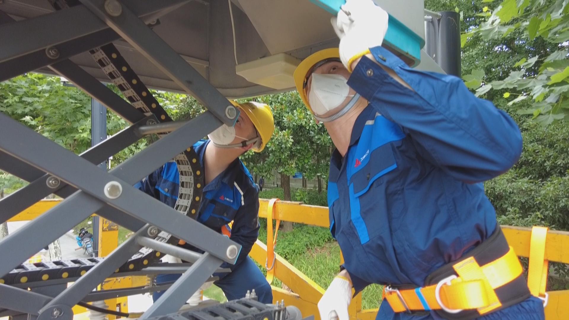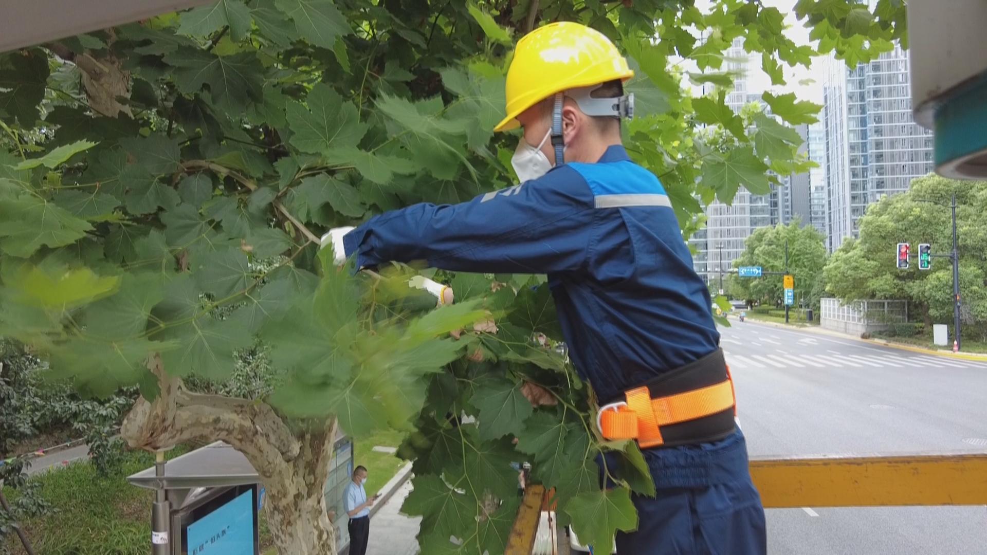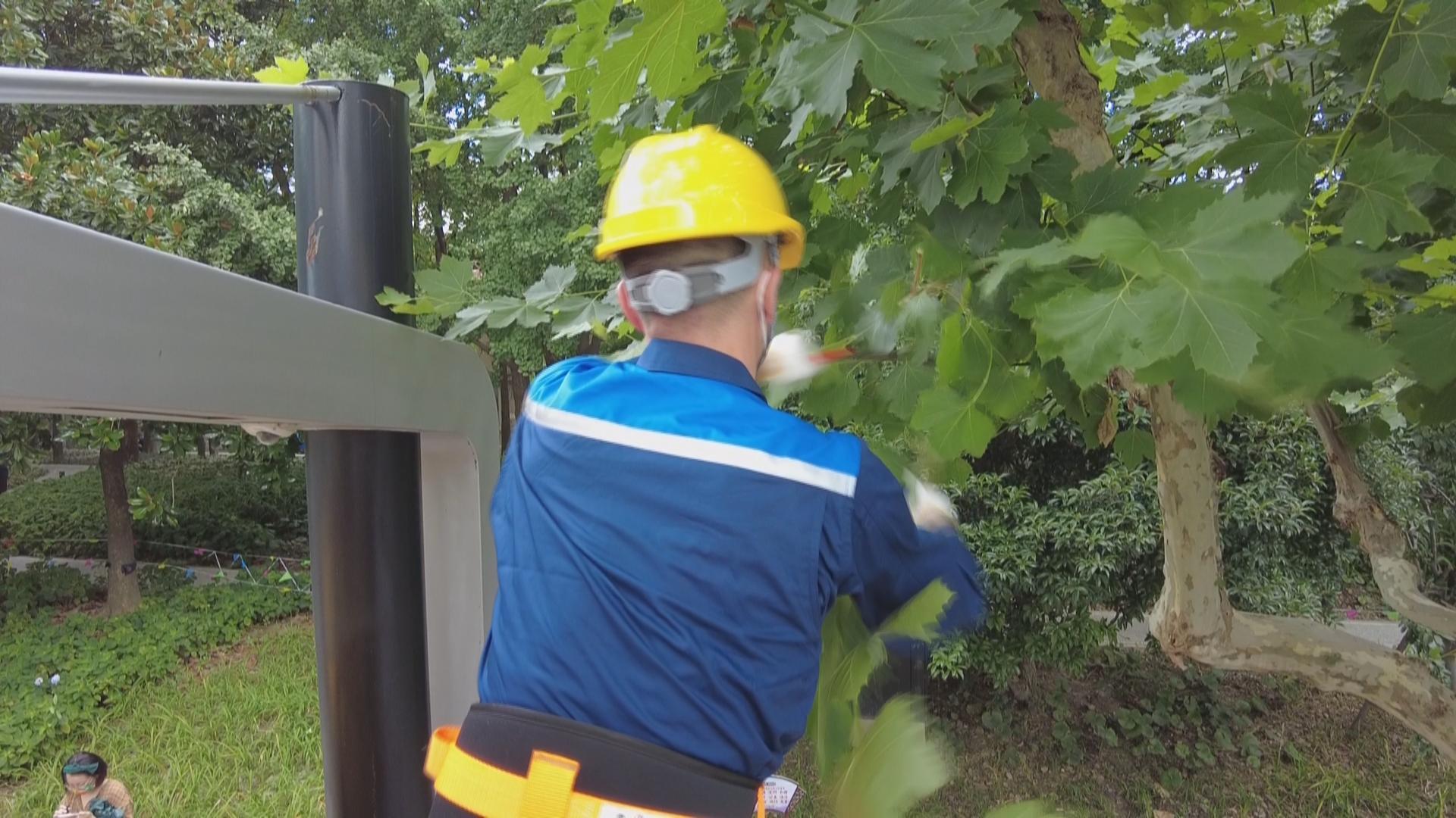同时,由于下压式充电桩安装在路边露天的位置,工作人员登上抢修车缓缓上升,同时充电桩缓缓下降,工作人员会检查充电桩内是否有异物,检查过程中,工作人员发现一旁的大树树枝伸的比较长,上面茂盛的枝叶,距离充电桩过近,如果遇到大风大雨的天气,枝叶很容易掉进充电桩,树枝也容易刮到充电桩,为此,工作人员现场对伸长的树枝做了修剪。此外,工作人员利用专业的仪器对供电设备的绝缘体、湿度等进行检查。