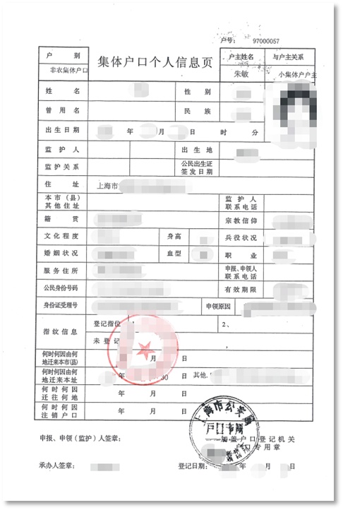 集体户口页复印件,加盖单位章(样张)