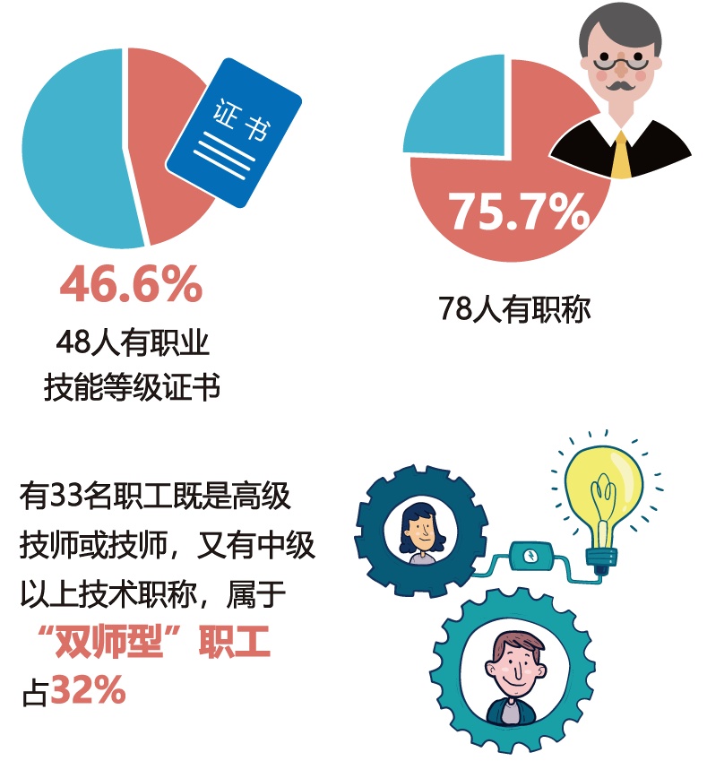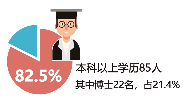 中共党员及预备党员共79名,占76.7%;专业技术人员在内的一线职工95人,占92.2%。