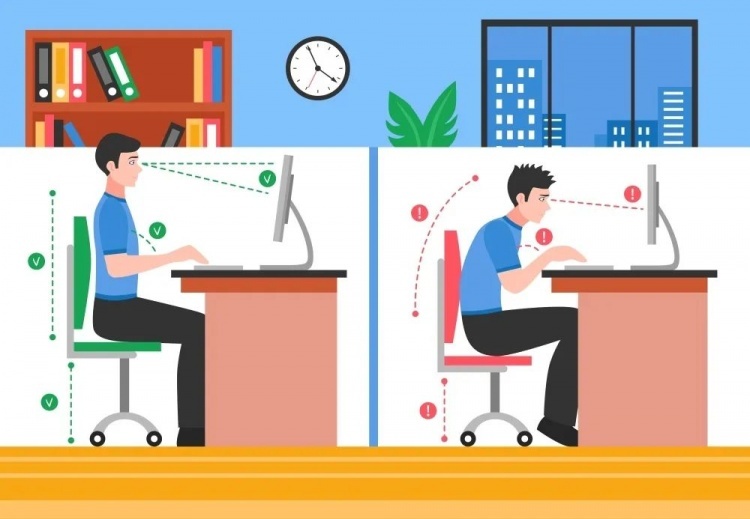 椅子:选择屈髋屈膝90°、能够让大腿平行于地面、小腿垂直于地面且后背有倚靠的椅子。可以的话,在腰后加一个腰垫,对腰椎形成支撑更有利于维持生理弯曲。