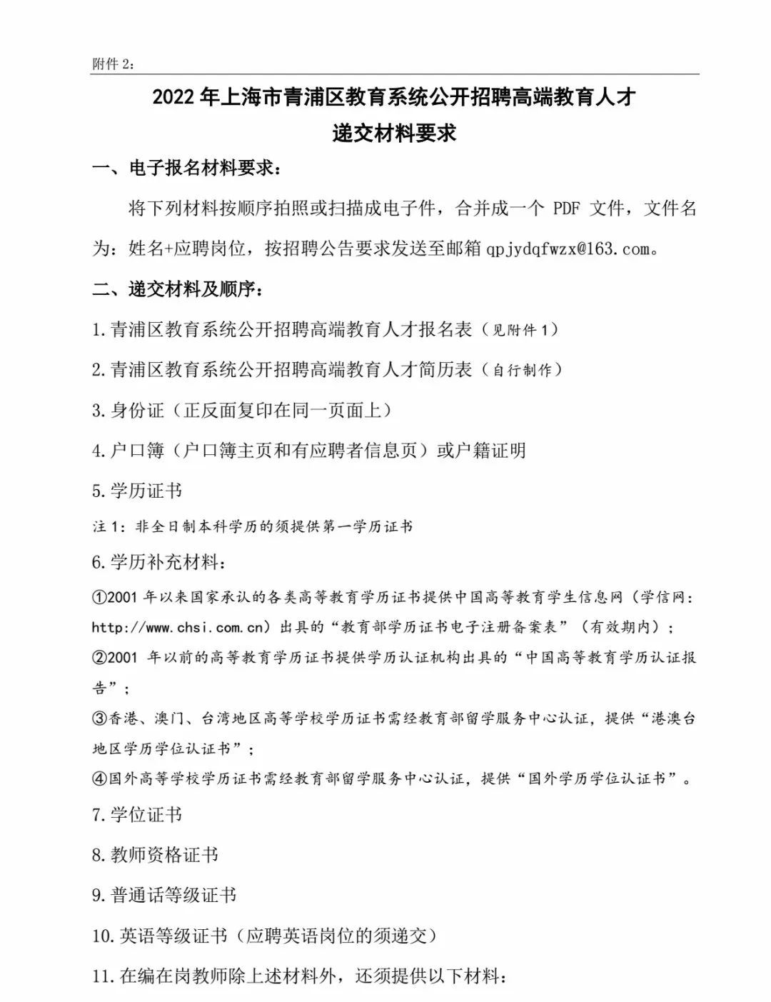 附件2:2022年上海市青浦区教育系统公开招聘高端教育人才递交材料要求