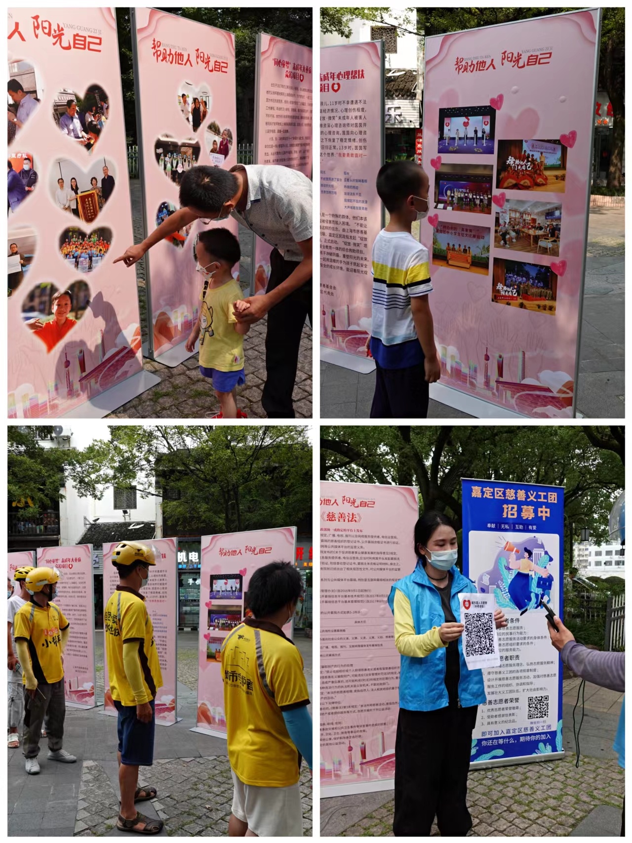 活动现场,上海市慈善基金会嘉定区代表处成员单位志愿者和工作人员通过展板、发放宣传彩页等形式宣传《慈善法》,提高群众的知晓率。