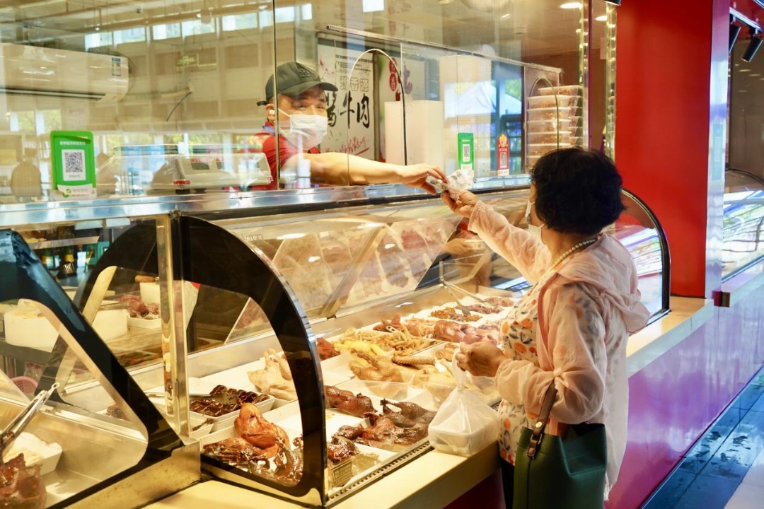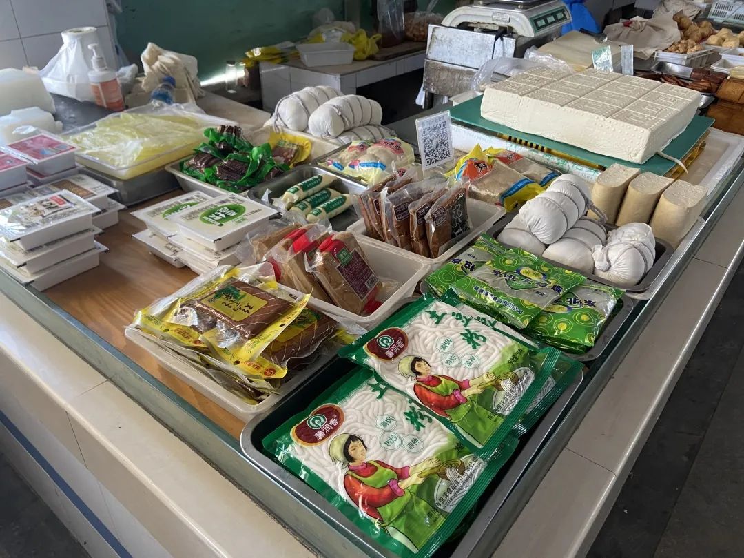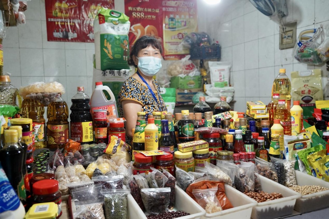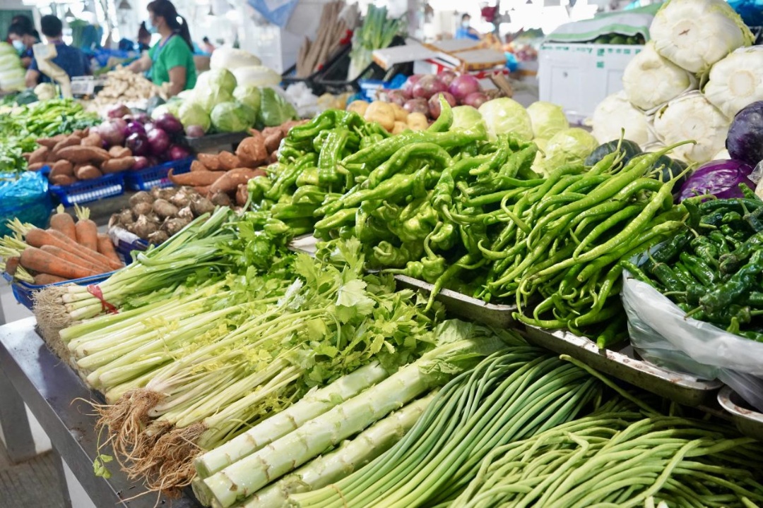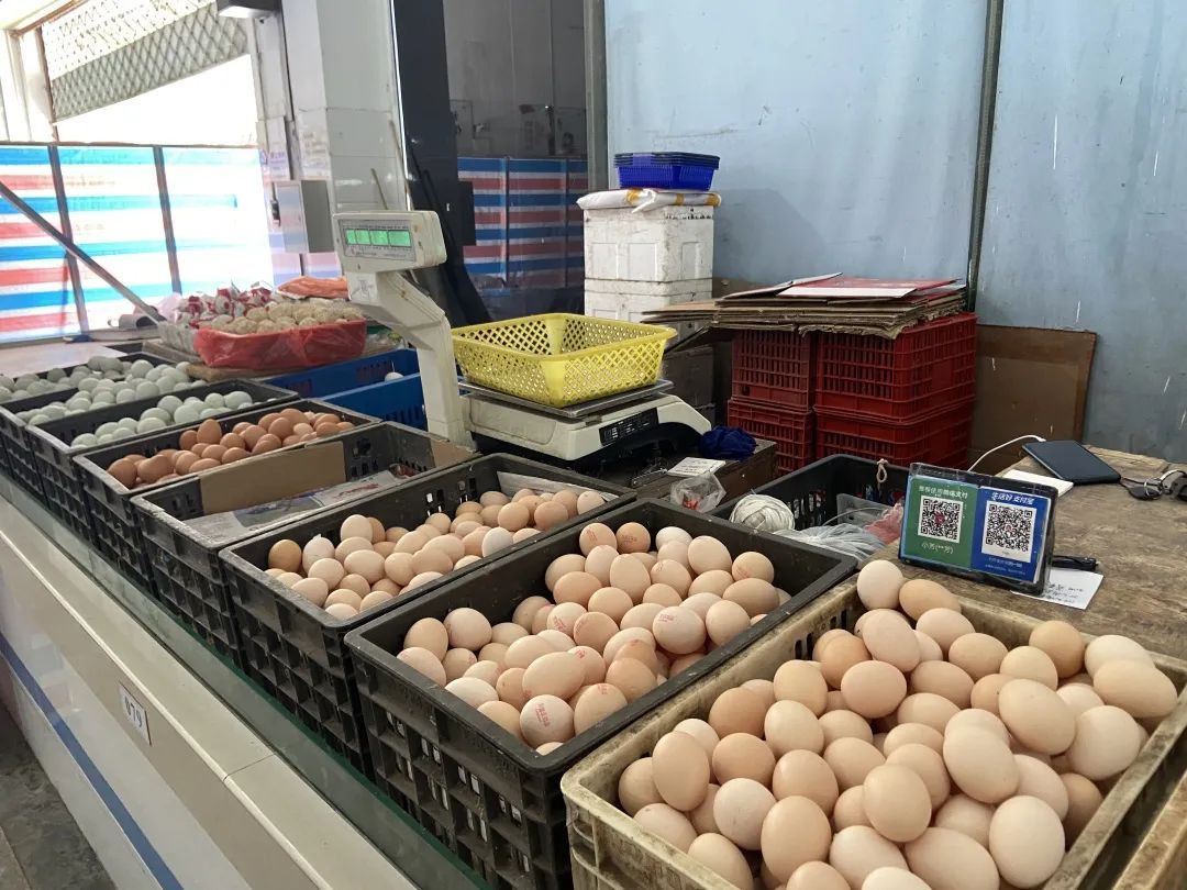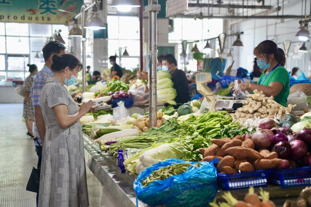 豇豆、茄子、丝瓜、芹菜等应季蔬菜琳琅满目,肉类、水产类、蔬菜类、米面粮油类货品供应充足。