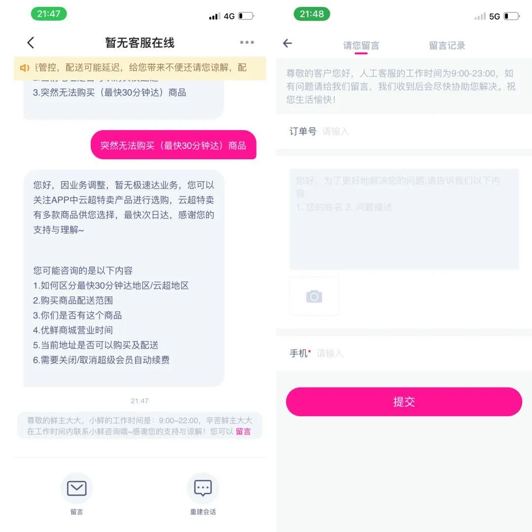 此外,记者点击在线客服发现,21时47分时页面显示暂无客服在线,而页面下方显示客服的工作时间为9:00至22:00。此外,记者点击页面中的重建会话无效,但可以针对订单问题进行留言。