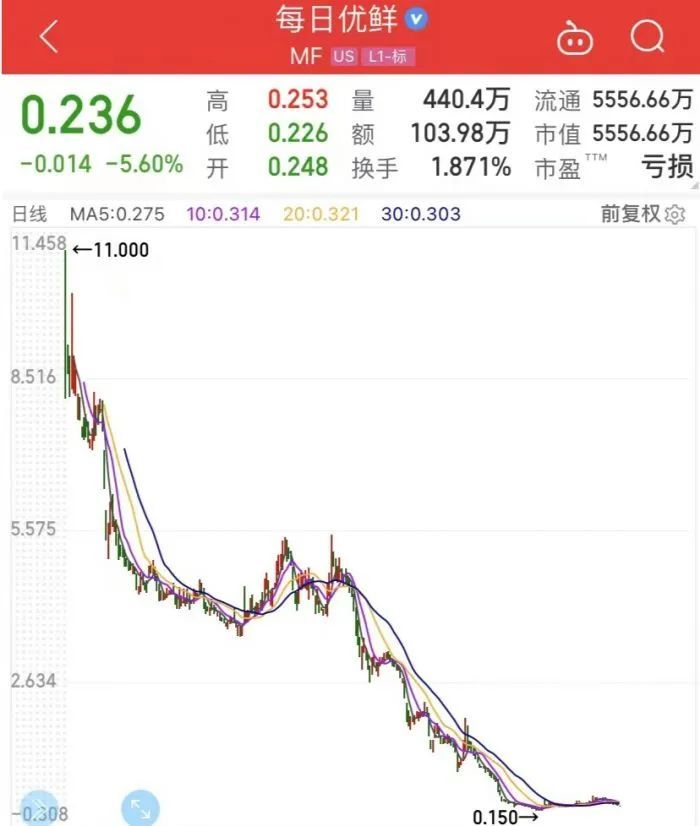 自今年4月19日后,每日优鲜的股价就长期持续处于1美元以下,最新财务数据还停留在2021年第三季度,2021年Q3,每日优鲜净亏损为9.74亿元。美东时间7月27日收盘,每日优鲜股价已跌至0.236美元/股,不足发行价的2%,总市值仅5545万美元。根据纳斯达克规定,上市公司股价若连续30个交易日低于1美元就会收到退市警告,每日优鲜离退市还会远吗?