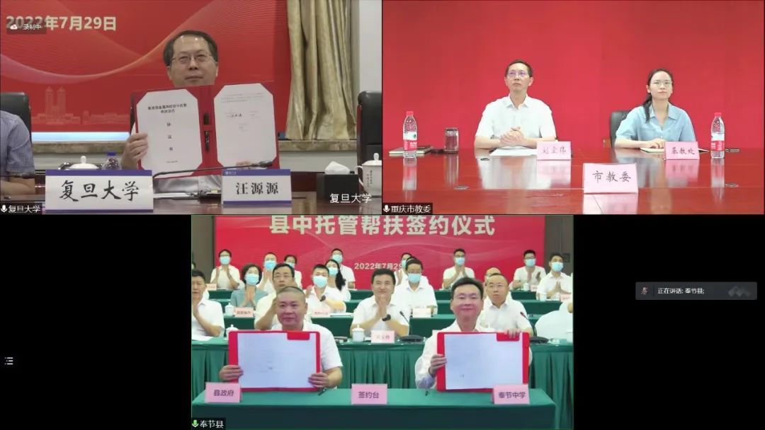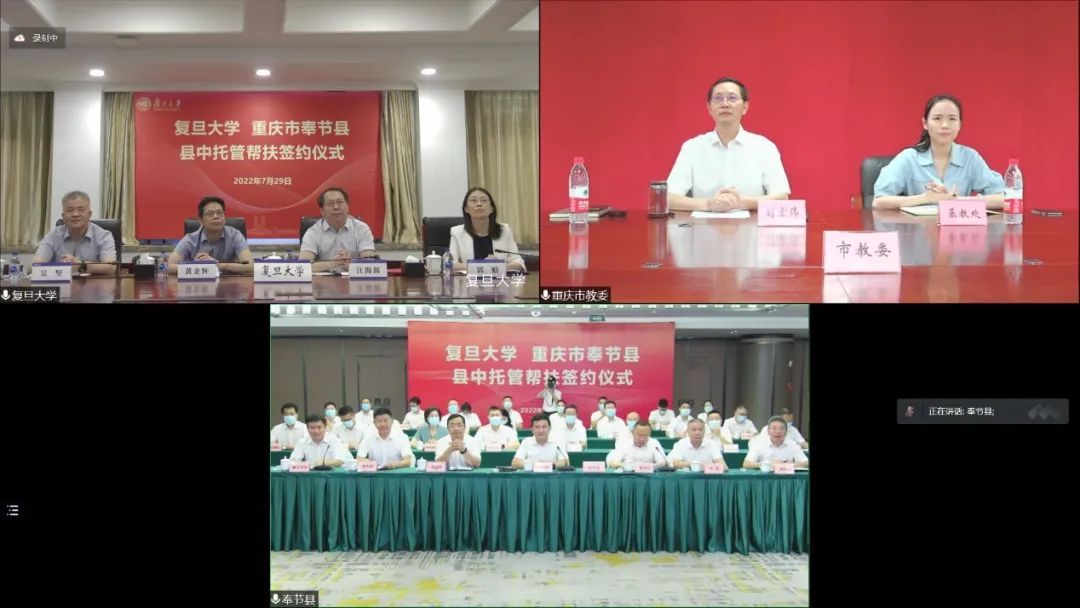 7月29日上午,复旦大学先后举行与广西都安瑶族自治县、重庆市奉节县县中托管帮扶签约仪式。视频在线签署《教育部直属高校县中托管帮扶项目协议书》,托管帮扶广西都安瑶族自治县高级中学、重庆市奉节中学两所县域高中。