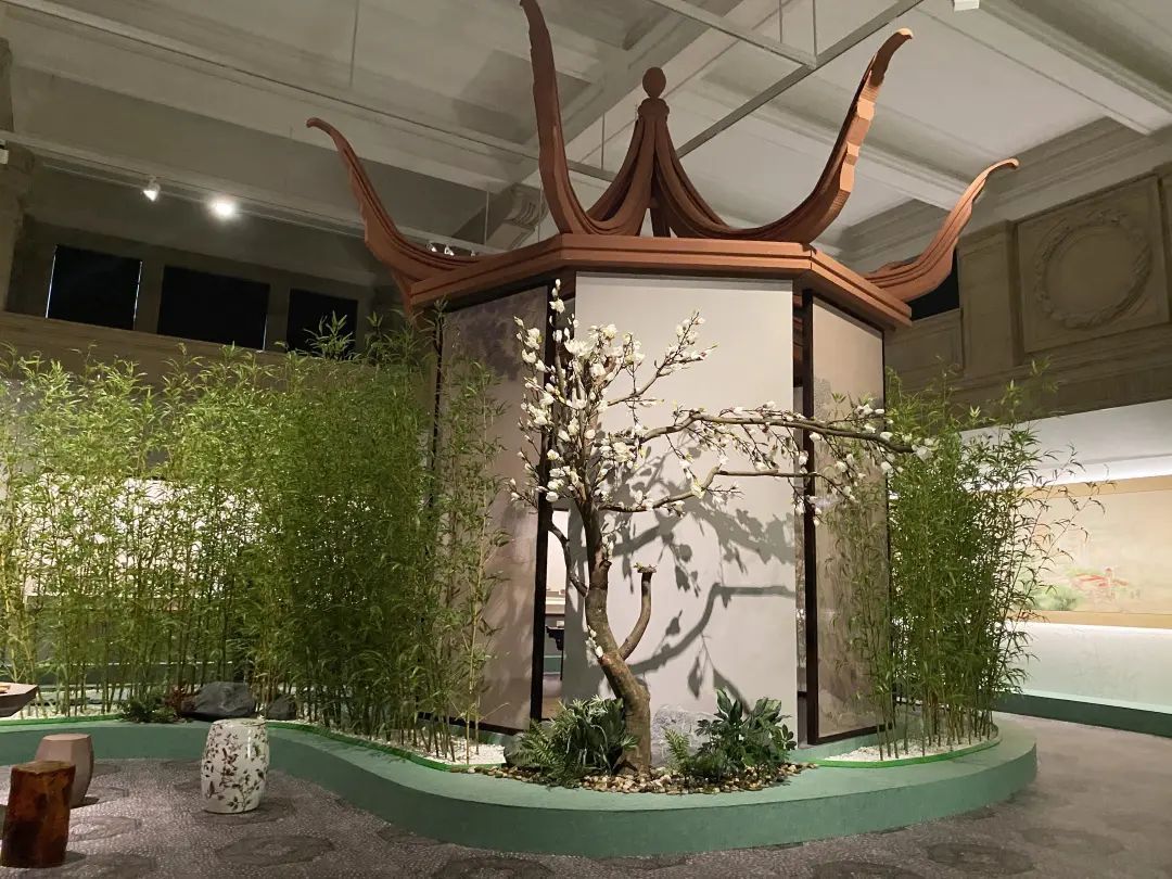 值得一提的是,本次展览的设计特别注重江南园林式的空间氛围营造,将陈列内容置于轩、堂、亭、馆、斋中,使观众在观展同时感受江南园林的移步换景之美。牡丹亭戏台、竹林对弈、曲水流觞等别具匠心的布景,就像是把整个江南园林搬进了博物馆,给予观众沉浸式观展体验。