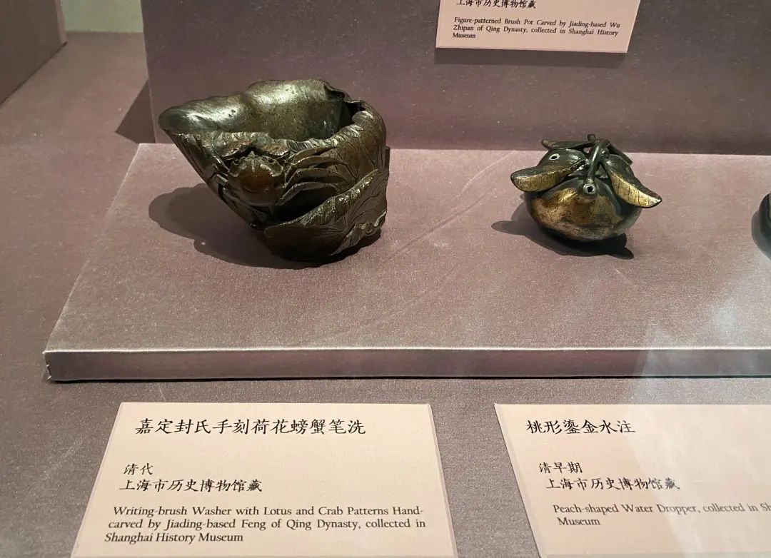 文房是文人雅士挥毫泼墨、留下千古绝句和描画锦绣山河之所在。展品中,嘉定封氏手刻荷花螃蟹洗,寓意“和谐”,立意深远。以竹根圆雕作折枝荷叶形,荷叶翻卷,筋脉浅刻,若隐若现。一侧于近底处高浮雕荷花,另一侧刻有一蟹,蟹眼圆浑,八爪足尖,如欲攀爬,雕刻极为生动写实,就像是从竹根直接化生而出。