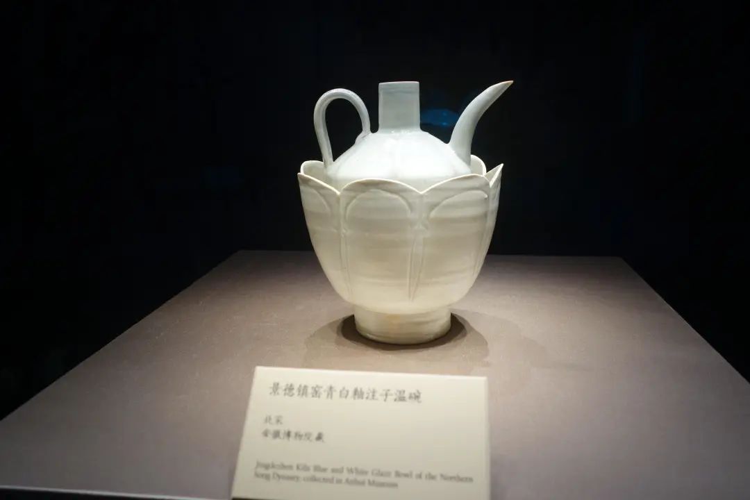 另一件重要展品北宋景德镇窑青白釉注子温碗由安徽博物院馆藏。全器由温碗、注子(即执壶)和壶盖组成,注子通体作六瓣瓜棱形,温碗形如一朵莲花,七瓣莲瓣合成深腹大碗。整体而看,注子温碗造型犹如一朵含苞欲放的仰莲,轻盈俏丽,气度高雅。