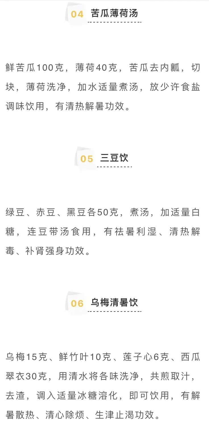丝瓜花20朵,扁豆花20朵,南瓜花5朵,将此三花洗净,加适量水煎煮约20分钟即可,取汁去渣,调入白糖,当茶饮,有清暑化湿功效。