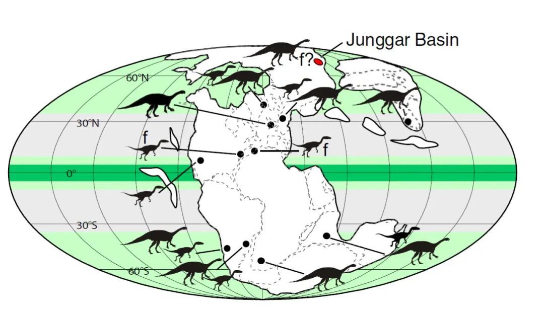 晚三叠世准噶尔盆地古地理位置及恐龙分布图。中科院南京地质古生物研究所供图