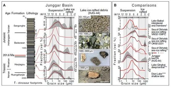 研究团队重新校正了准噶尔盆地的古纬度,认为其晚三叠世至早侏罗世位于潘吉亚大陆的北极地区(约北纬71度)。在野外考察中,他们首次在准噶尔盆地晚三叠世至早侏罗世湖沼相泥岩中,发现了保存精美的恐龙脚印化石。