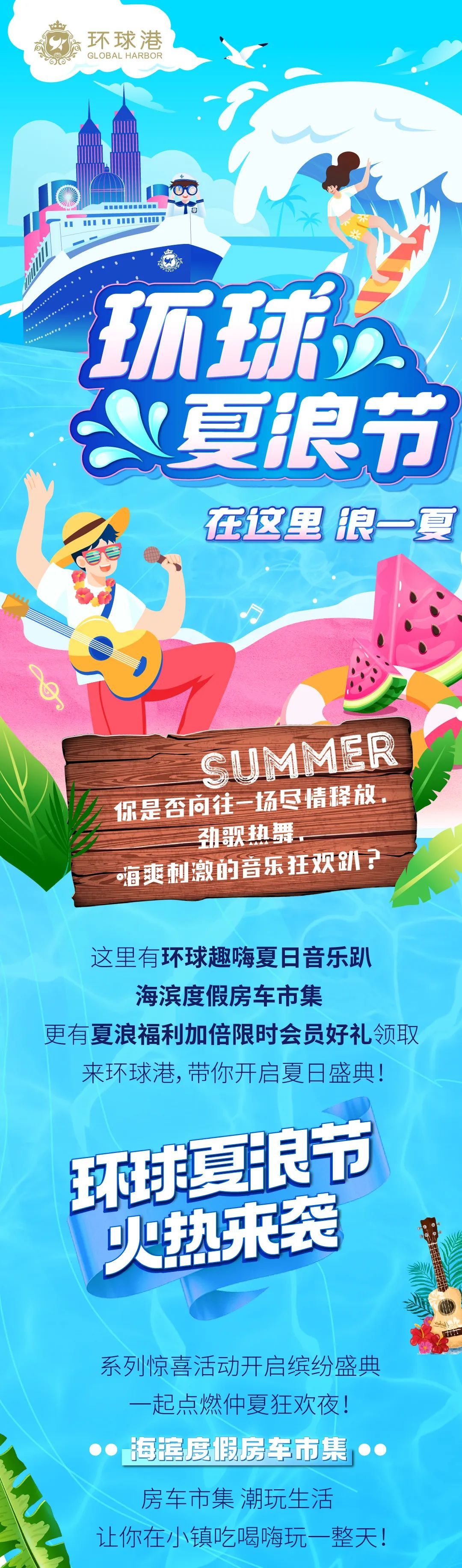 在环球港的世界港口小镇里,夏日盛典正在进行,你可以约上三五好友一起来参与环球趣嗨夏日音乐趴、海滨度假房车市集、露天电影、手工花艺等等一系列夏日活动。