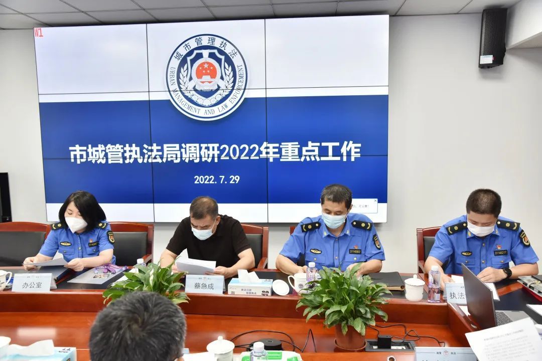 调研会上,青浦区城管执法局党组书记、局长蔡急成围绕加强综合执法能力建设、重点领域专项执法、“智慧城管”建设应用、队伍规范化管理、党建引领、社区治理以及“防疫情、稳经济、保安全”大走访、大排查等方面介绍了今年重点工作推进情况。