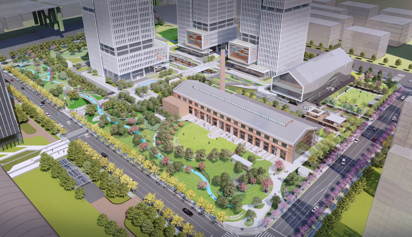 本次规划设计亮点在于突破道路边界,打造“U型界面”设计方案,将道路绿化空间结合周边公共绿地、园区、校园及住宅外围融为一体,增强人性化设计及公共绿地的参与性,最大化地促进街道与园区的融合发展,提供更加安全、舒适的步行空间,同时也是市北园区重要的形象界面。