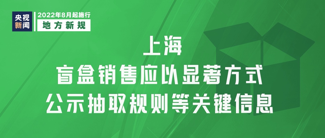新修订的《上海市消费者权益保护条例》8月1日起施行。《条例》规定,经营者采取随机抽取的方式向消费者销售特定范围内商品或者提供服务的,应当按照规定以显著方式公示抽取规则、商品或者服务分布、提供数量、抽取概率等关键信息。