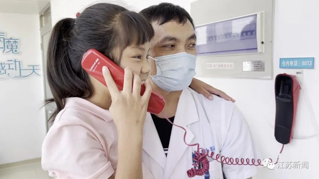 7月27日,在医生的帮助下,李明泽来到爸爸所在的层流病房外,父女俩通过内线电话隔着玻璃互相打气。