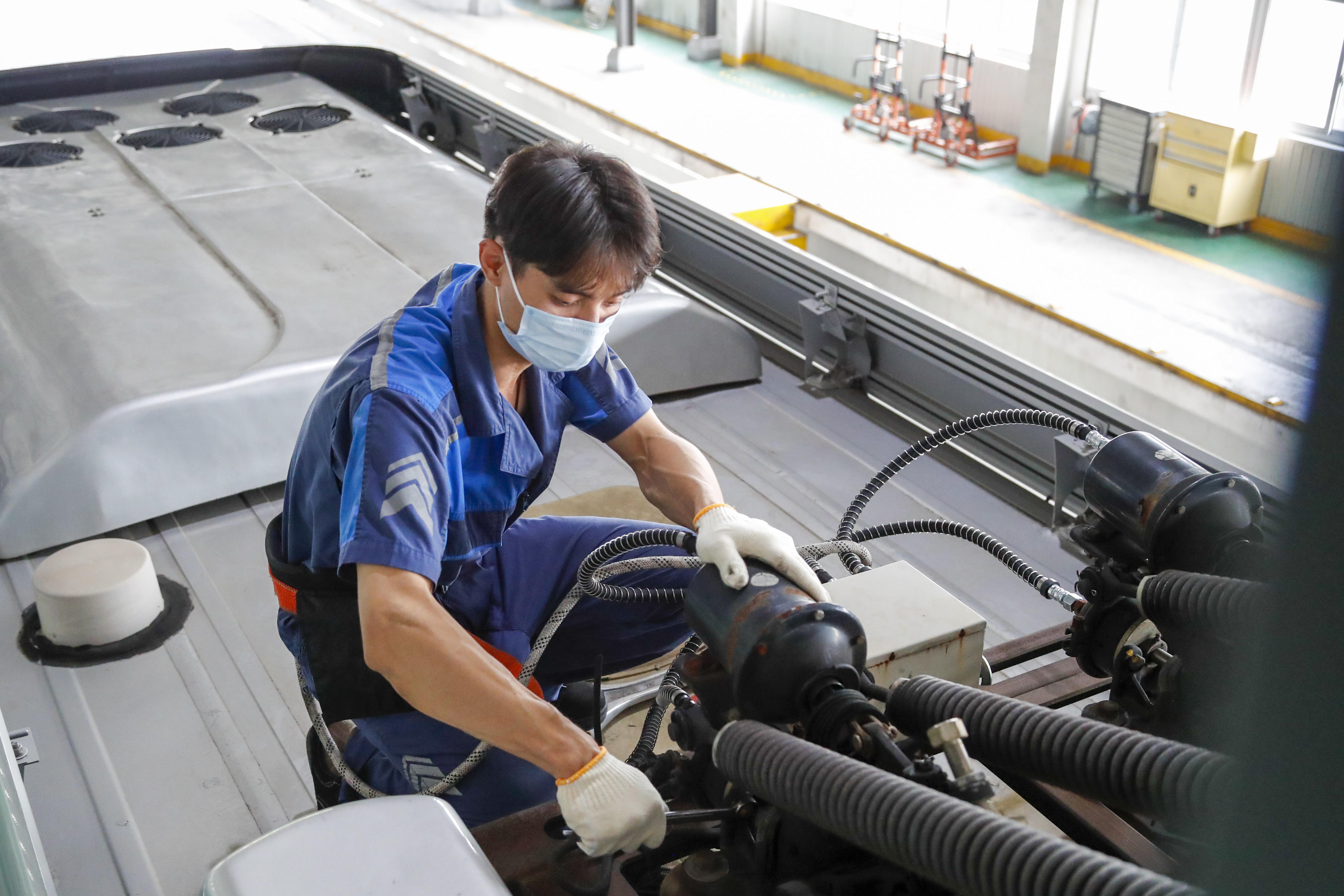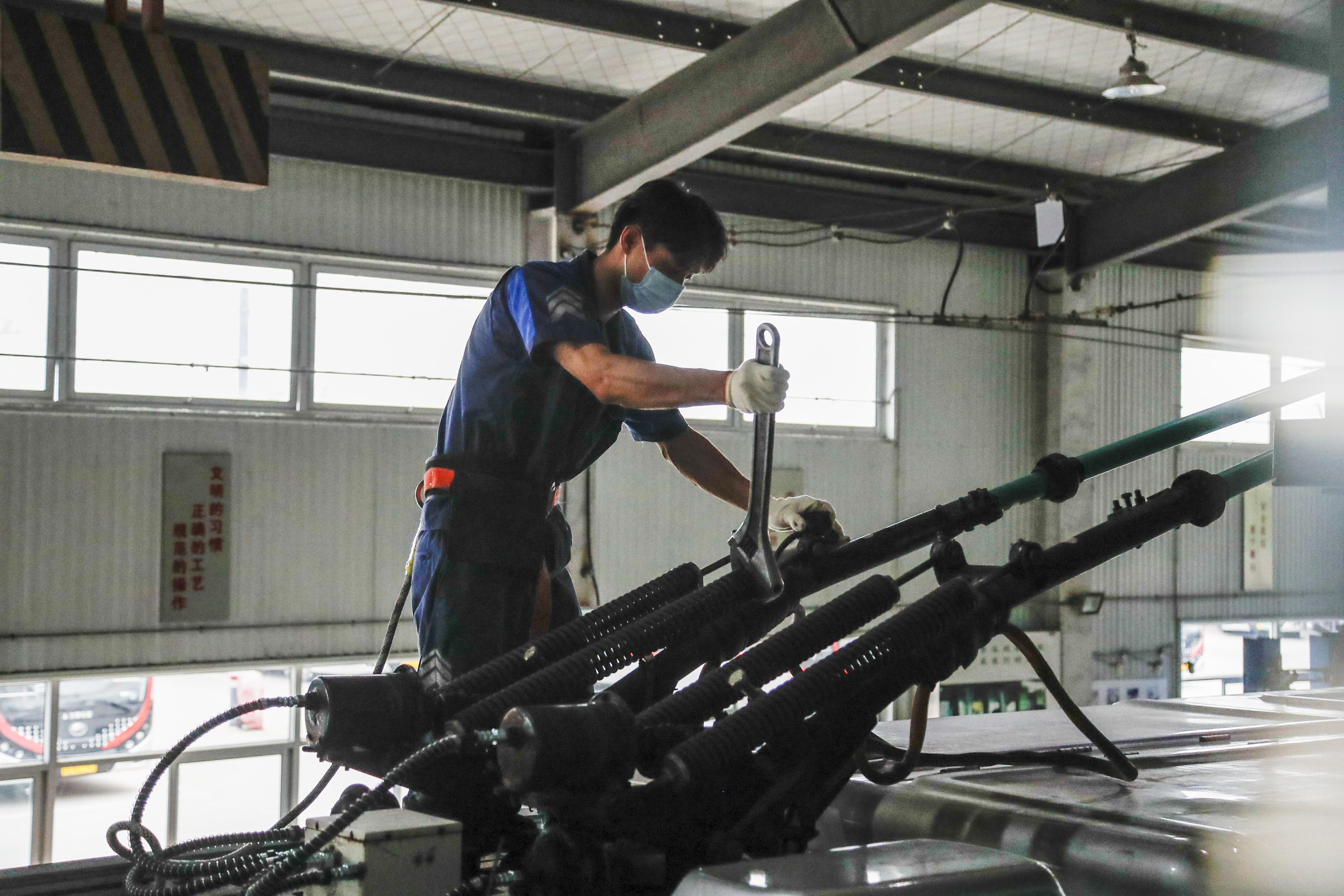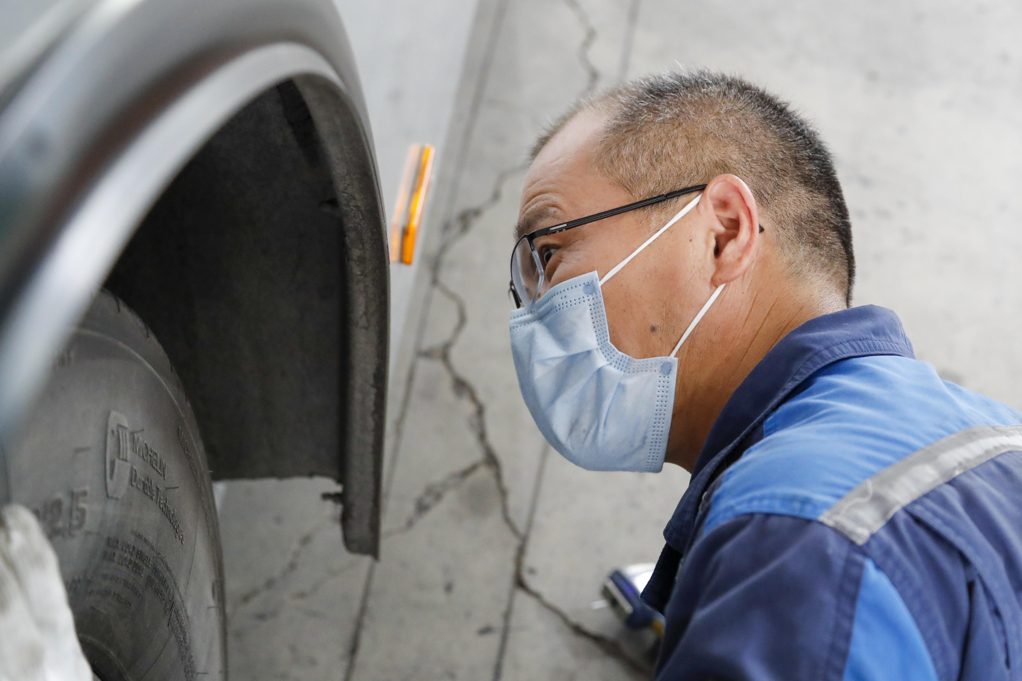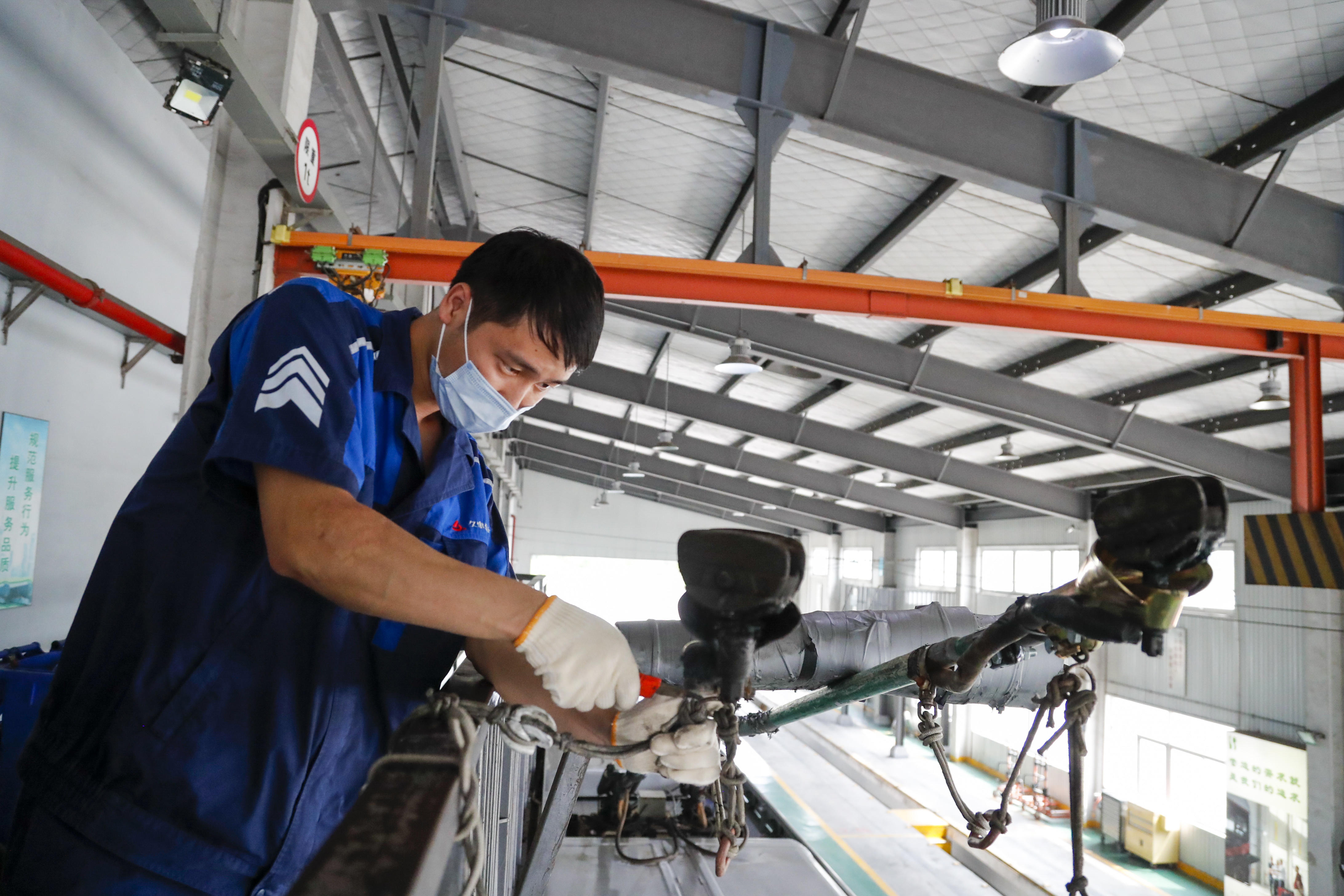 高温天气是汽车故障的多发期,为了保证维通风和安全,修车间不能安装空调。当公交车被送至报修车间,做好与司机的交接后,秦立和多年搭档金玉玺就要开始先对车辆外围进行检查,包括测量轮胎胎花、检查雨刮器、灯照、反光镜、逃生阀等,“像轮胎胎花,检测数值一旦在6mm左右就是极限了,胎花没了抓地力肯定就不行了,那就一定要换掉。”秦师傅蹲在地上测量完前胎的胎花后便进了车厢,熄火后的车厢内,温度比维修车间还要高上7-8℃,对车内的保险带、报警器等进行检测,车窗、扶手检查完毕后,清理空调滤网也是必不可少的一环。“车内车外都检查完以后,我们就要上镁金台去检查一下车顶,因为是电车,所以煤精(集电杆碳刷,具有让“鞭子”采电的作用)和集电杆是必检项。”从车上下来,秦立手臂上的汗水早已哗哗落下。