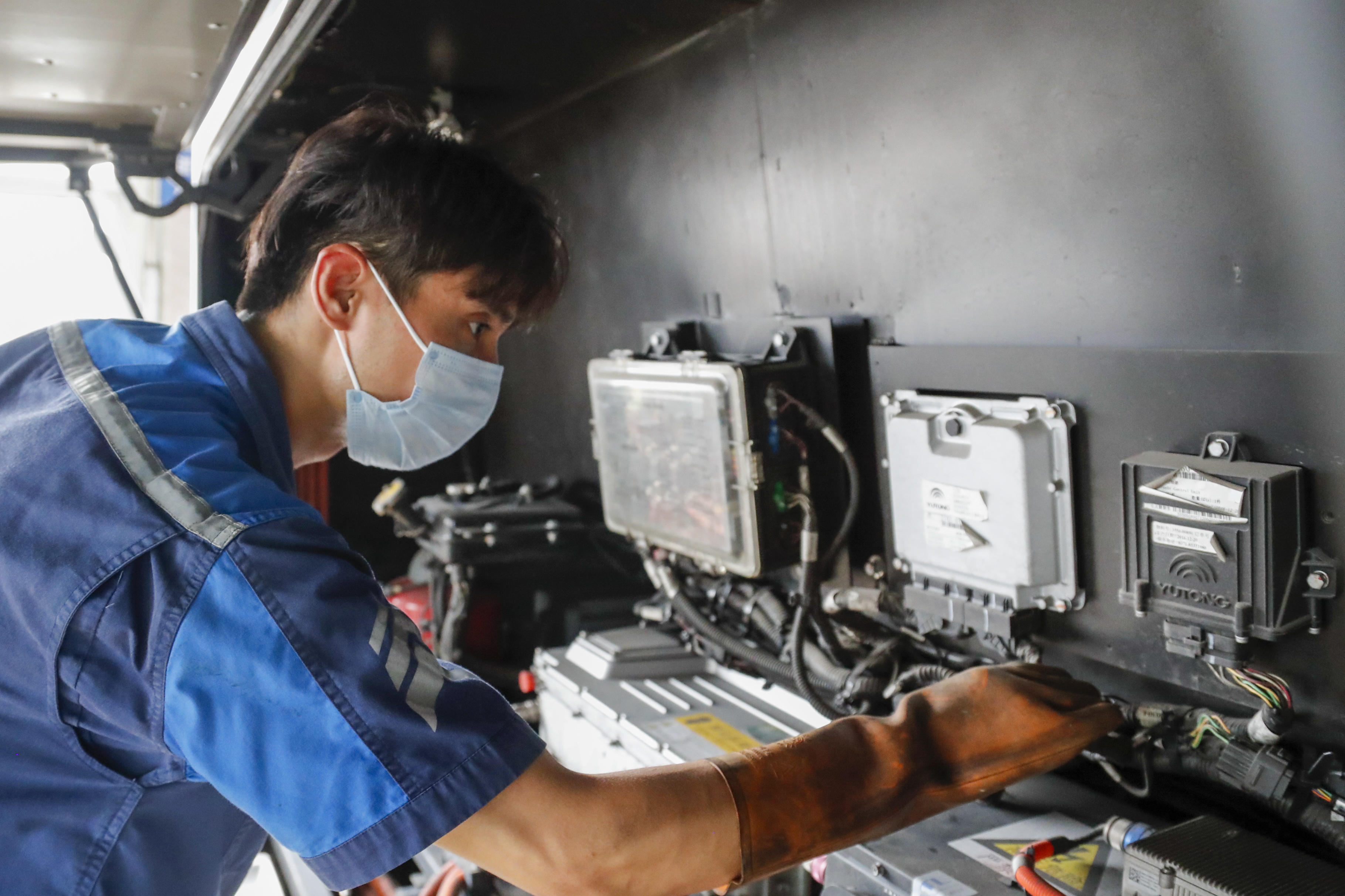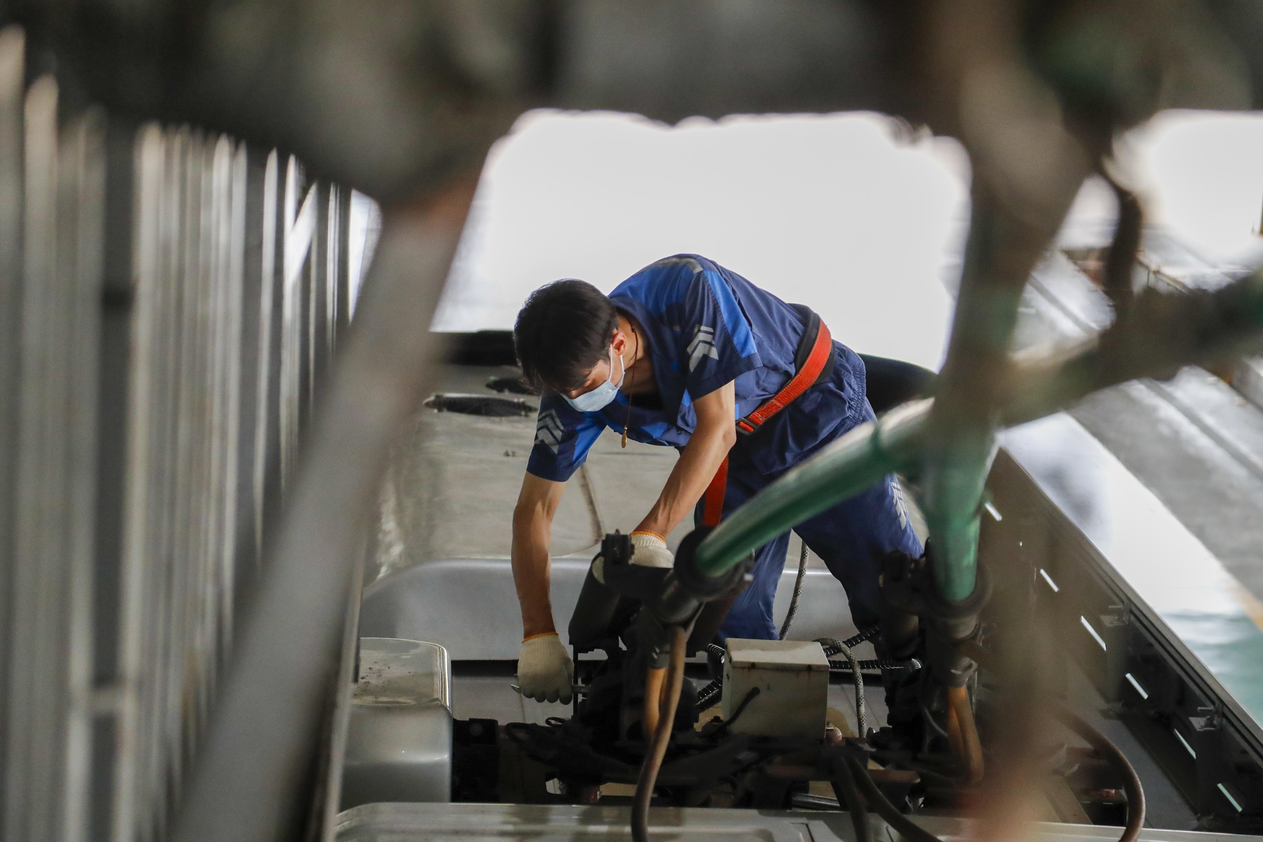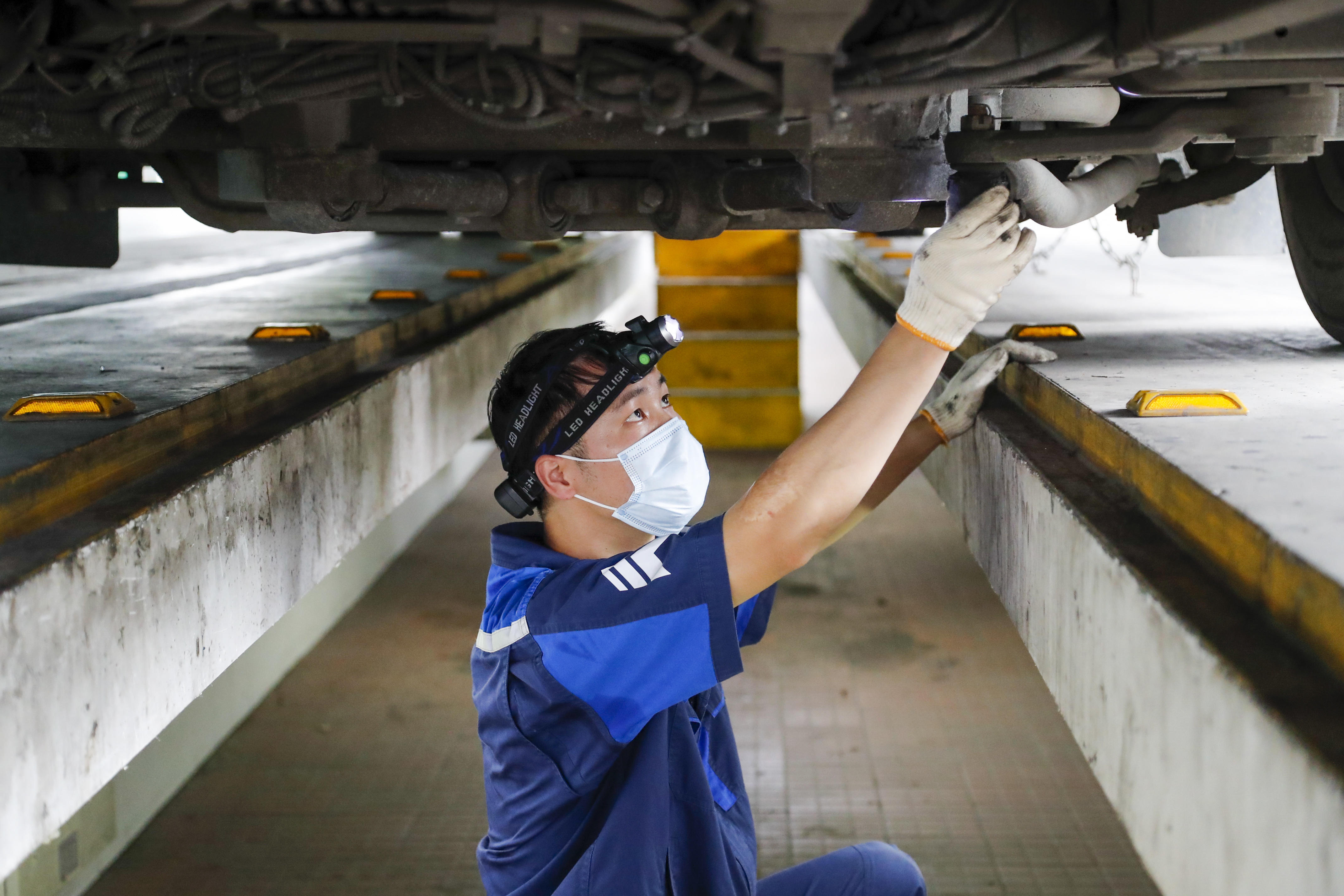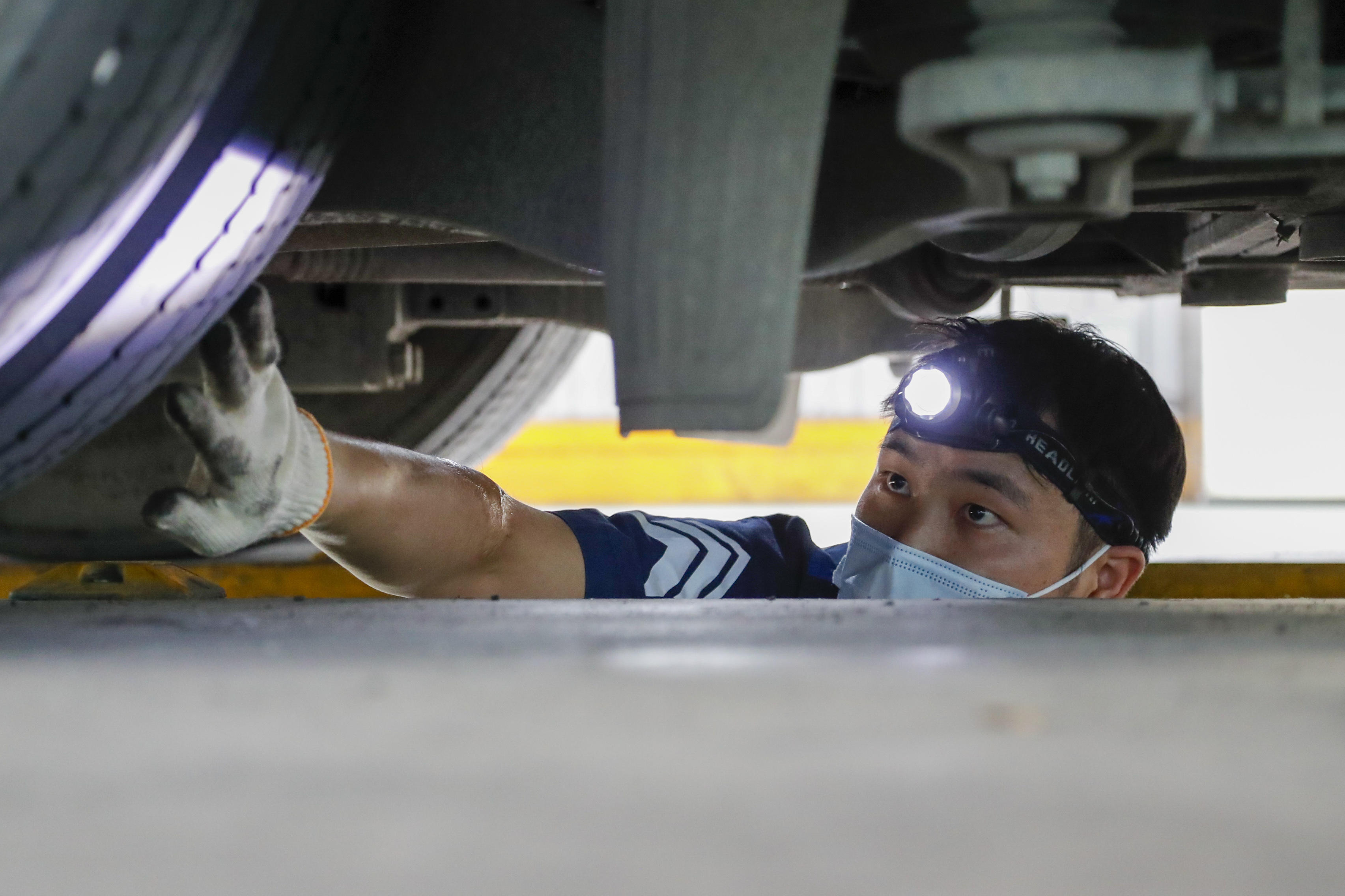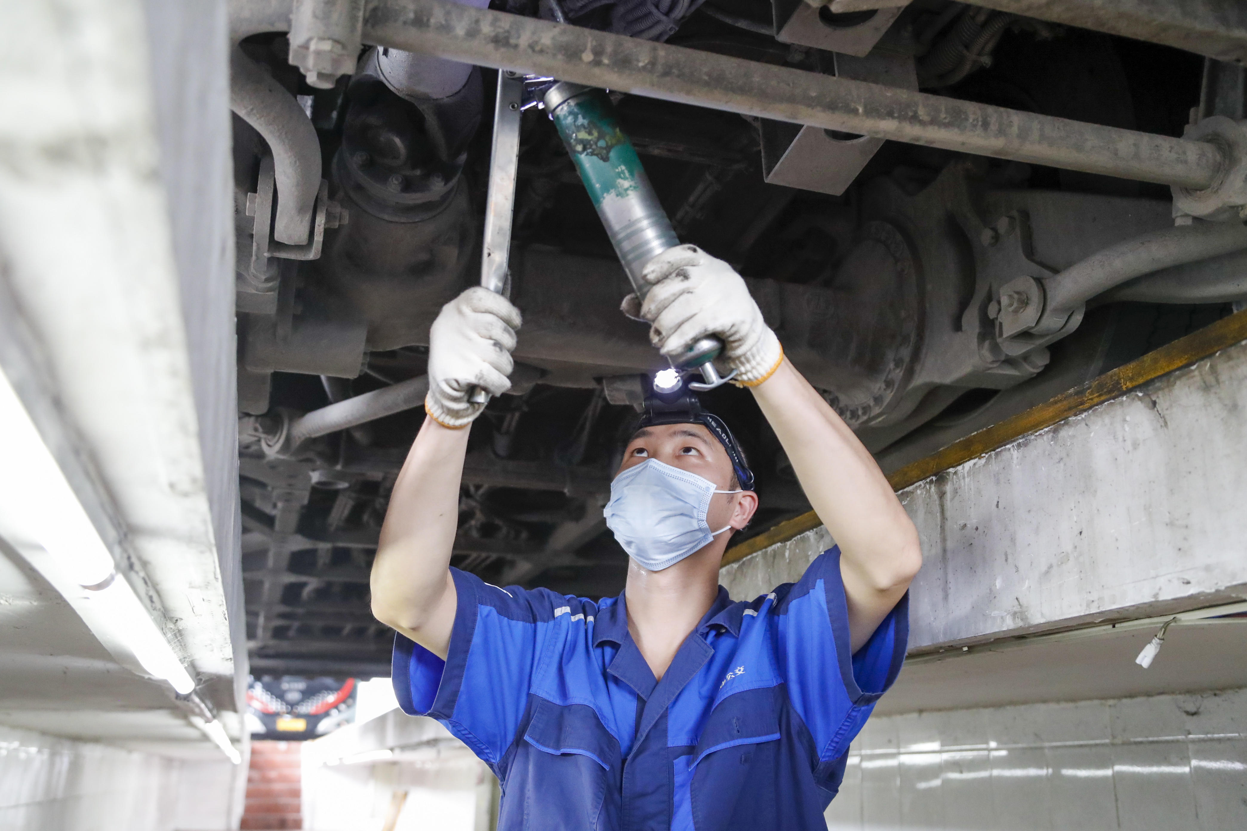 像秦立这样的汽修工,他们修起车来短则待上半小时以上,多则待上几小时。更有时,还会一起挤在本就不宽敞的地沟里对车辆“大问题”进行检修。维修公交车不是简单的敲敲打打,每一个数值、每一颗螺丝都关系到所有乘客的安全。他们克服的也不仅是高温工作环境,满身的油污、刺鼻的机油味、发烫的机器都早习以为常,为了尽快排除故障,不影响线路运营,他们拼的是速度、保的是质量。