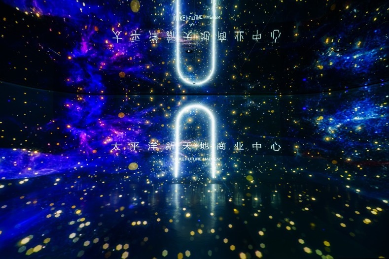 入口通道利用现代设计手法还原石库门元素,以及无限镜装置形成无限延伸的未来空间感,寓意每一个时代都是崭新的新天地。碗幕影音区域,利用碗幕结构打造裸眼3D沉浸式体验效果,让参观者身临其境地感受太平洋新天地商业中心的未来与生长。