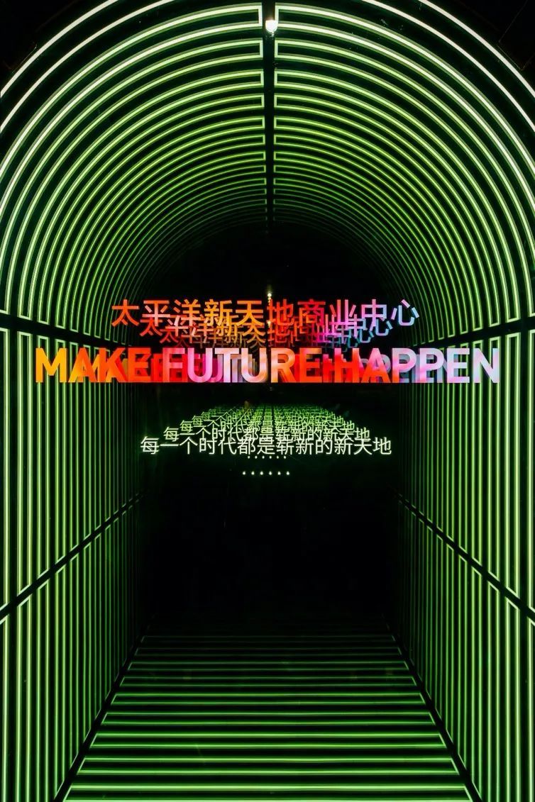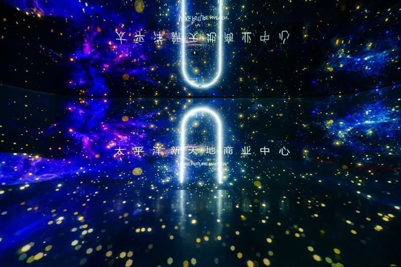 入口通道利用现代设计手法还原石库门元素,以及无限镜装置形成无限延伸的未来空间感,寓意每一个时代都是崭新的新天地。碗幕影音区域,利用碗幕结构打造裸眼3D沉浸式体验效果,让参观者身临其境地感受太平洋新天地商业中心的未来与生长。
