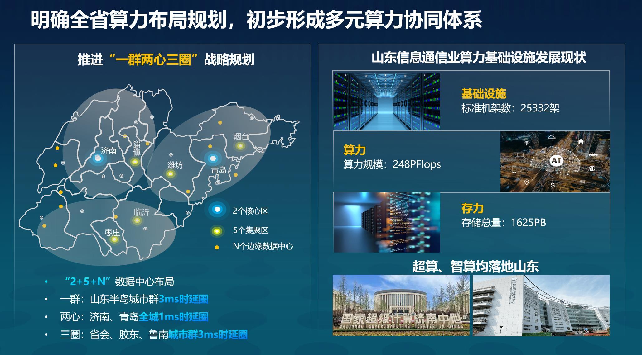 匹配山东省“一群两心三圈”战略规划,山东已经明确了“2+5+N”的新型数据中心布局规划,同时构建了济南、青岛全城1毫秒时延圈,省会、胶东、鲁南城市群3毫秒时延圈,山东半岛城市群3毫秒时延圈。截至目前,山东信息通信业数据中心标准机架数25339架,上架率64%,服务器86938台,存储容量1625PB,算力规模248P每秒浮点运算次数。同时济南超算中心、青岛人工智能计算中心均落地山东,初步形成省内多元算力协同体系。