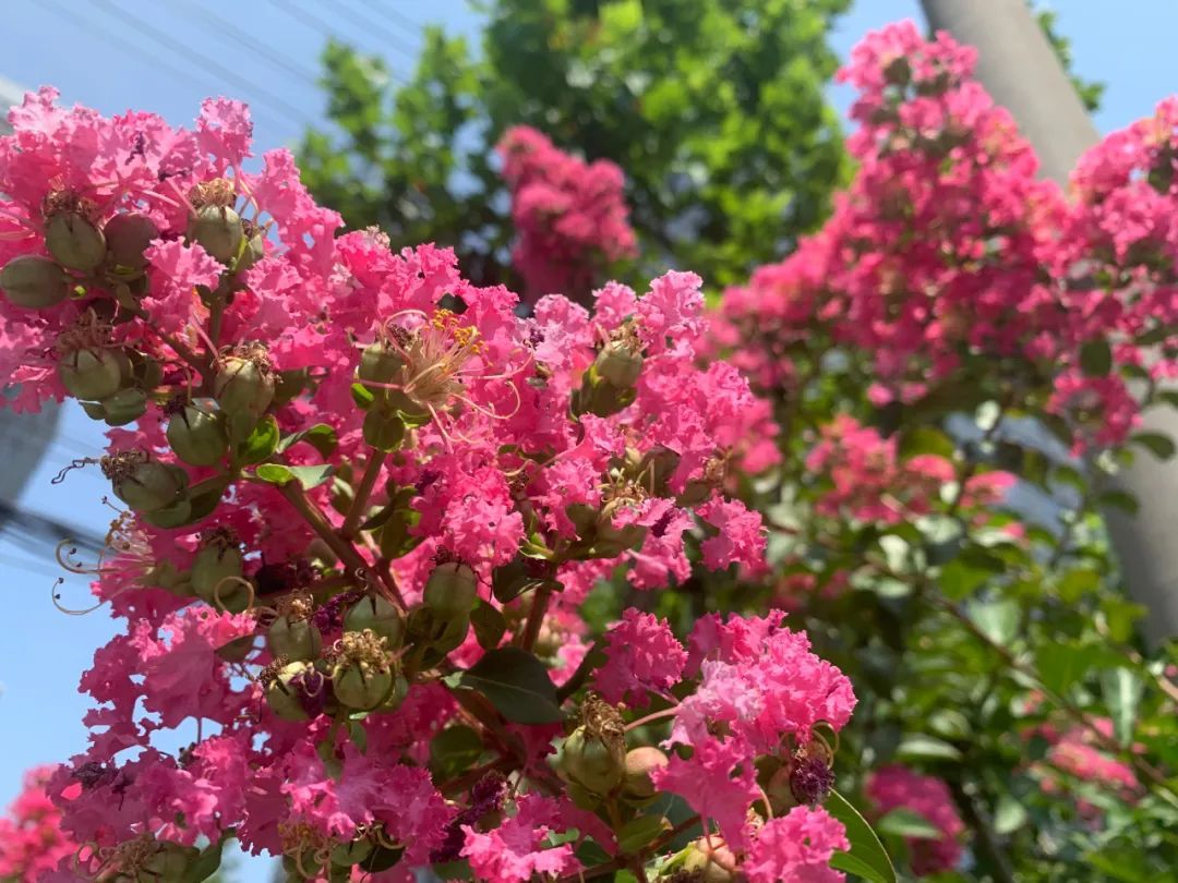 夏日申城热浪滚滚,街上行人步履匆匆,明媚的阳光下,紫薇花热情地“探”着头,目光所至,便与不期而遇的美好撞个满怀。