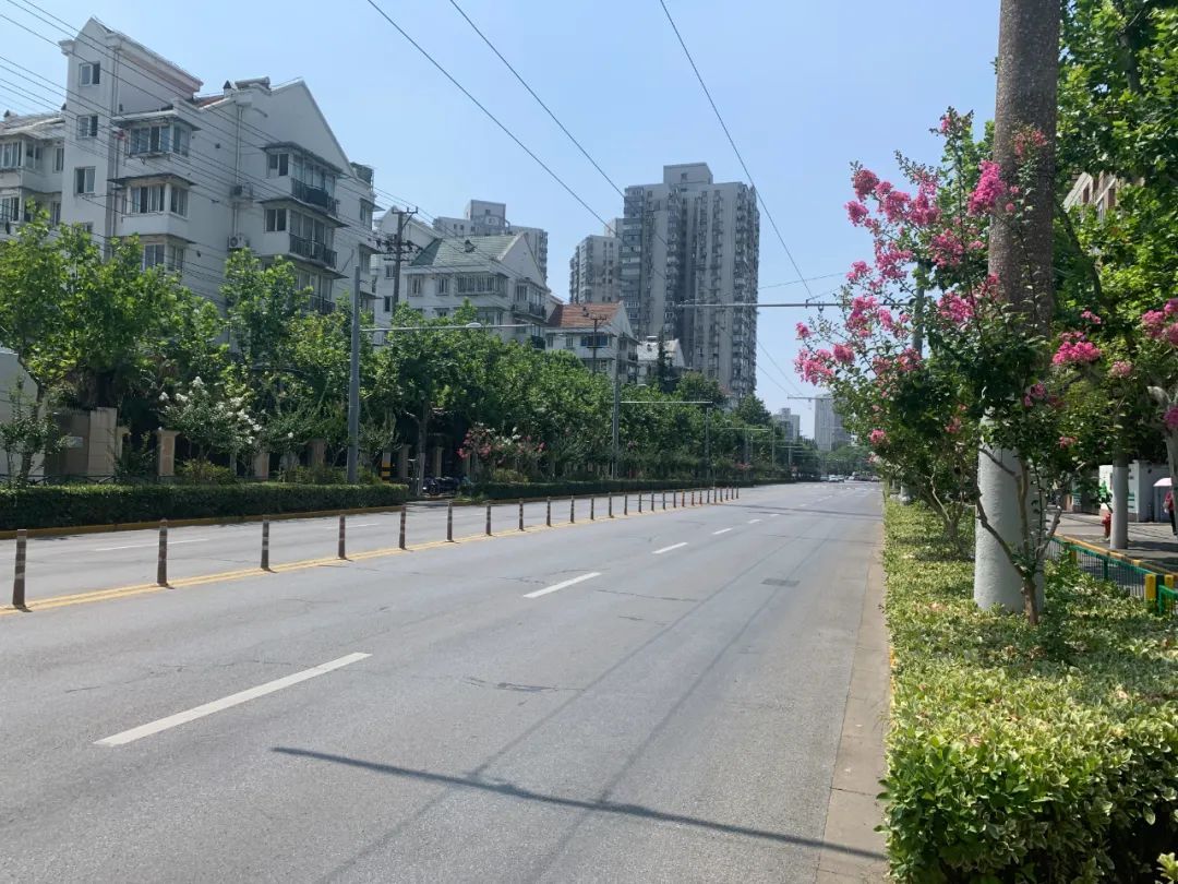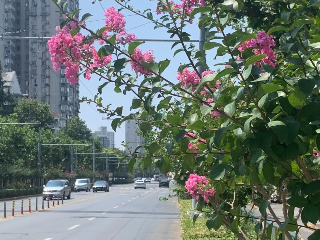 盛夏绿遮眼,此花红满堂。营口路道路两旁粉色的紫薇花斜斜地绽放枝头,在微风的吹拂下顽皮摇晃、明艳非常。