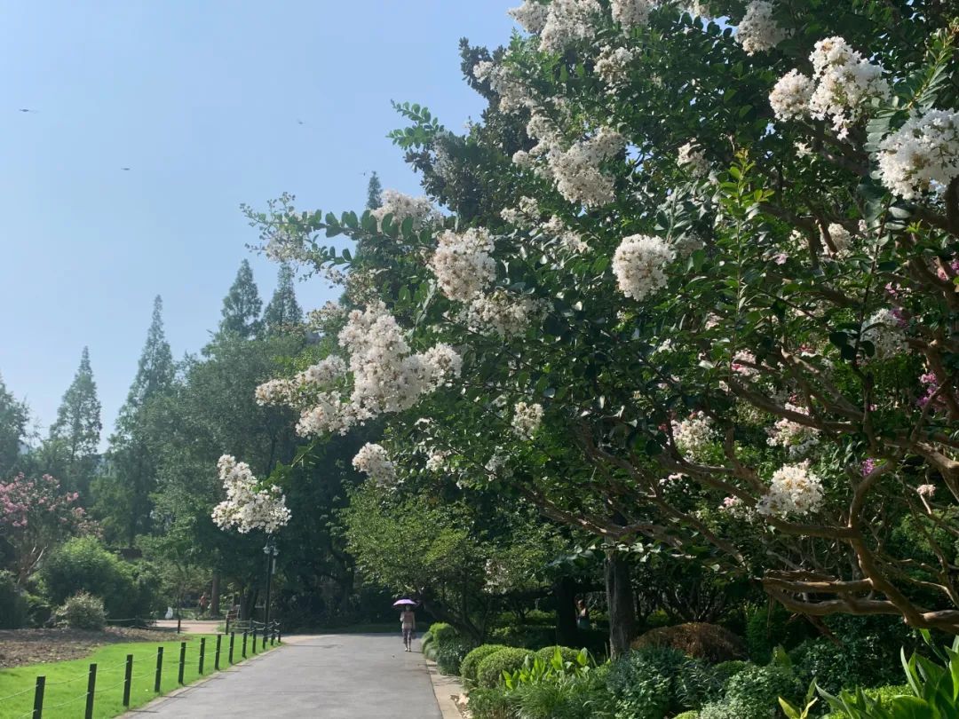 “白色的紫薇很少见,所以更加显眼,大家都很喜欢,开出的花有点像雨、像雾,盛夏时节看起来也十分清爽。”一位常游公园的市民表示。