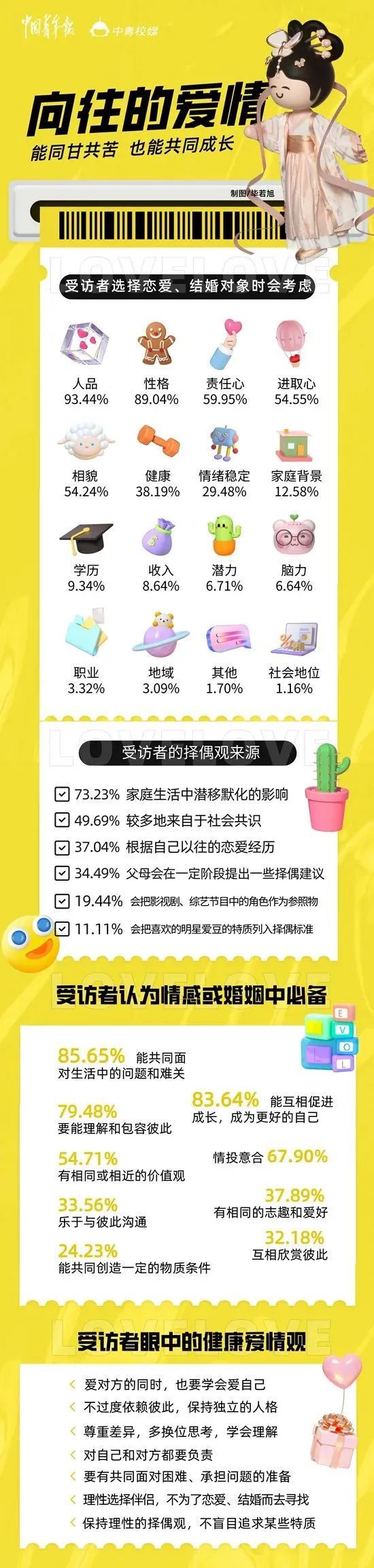 值得注意的是,93.44%受访者在寻找恋爱或结婚对象时最关注对方的人品;89.04%关注对方的性格;59.95%关注对方是否有责任心;进取心和相貌紧随其后,分别占受访总人数的54.55%和54.24%。