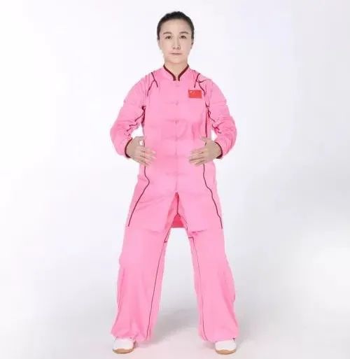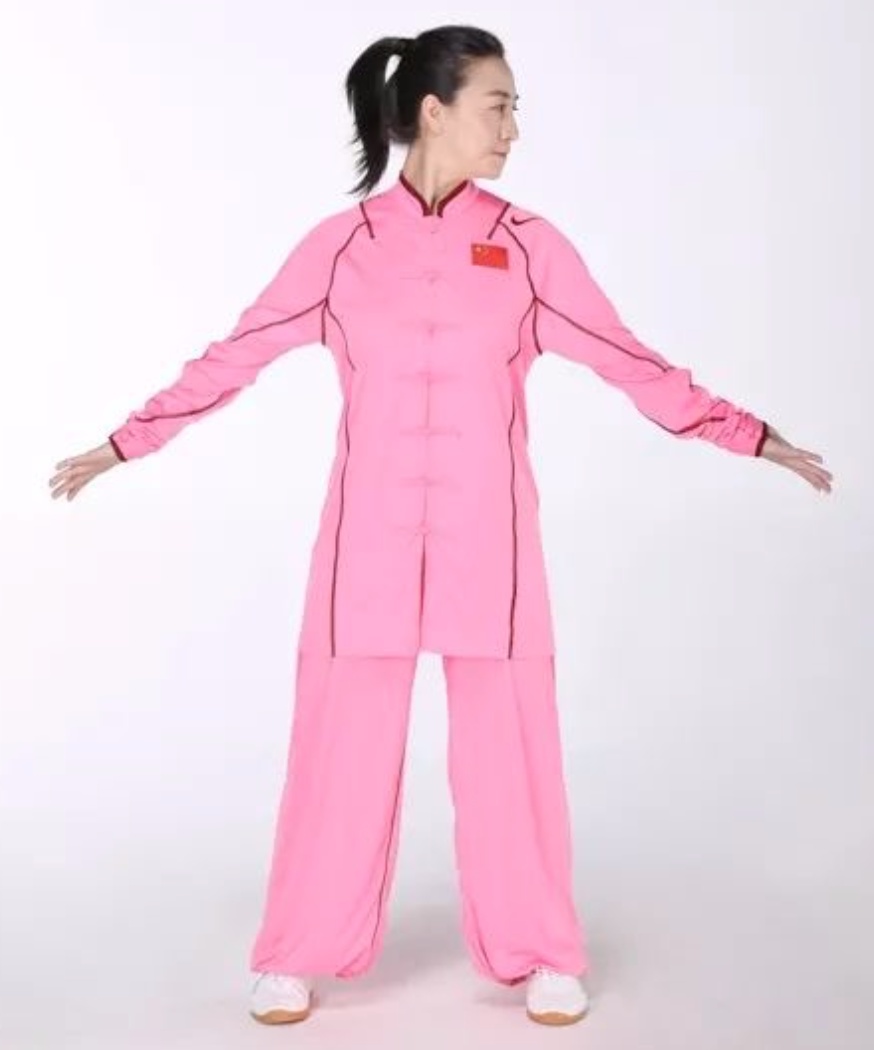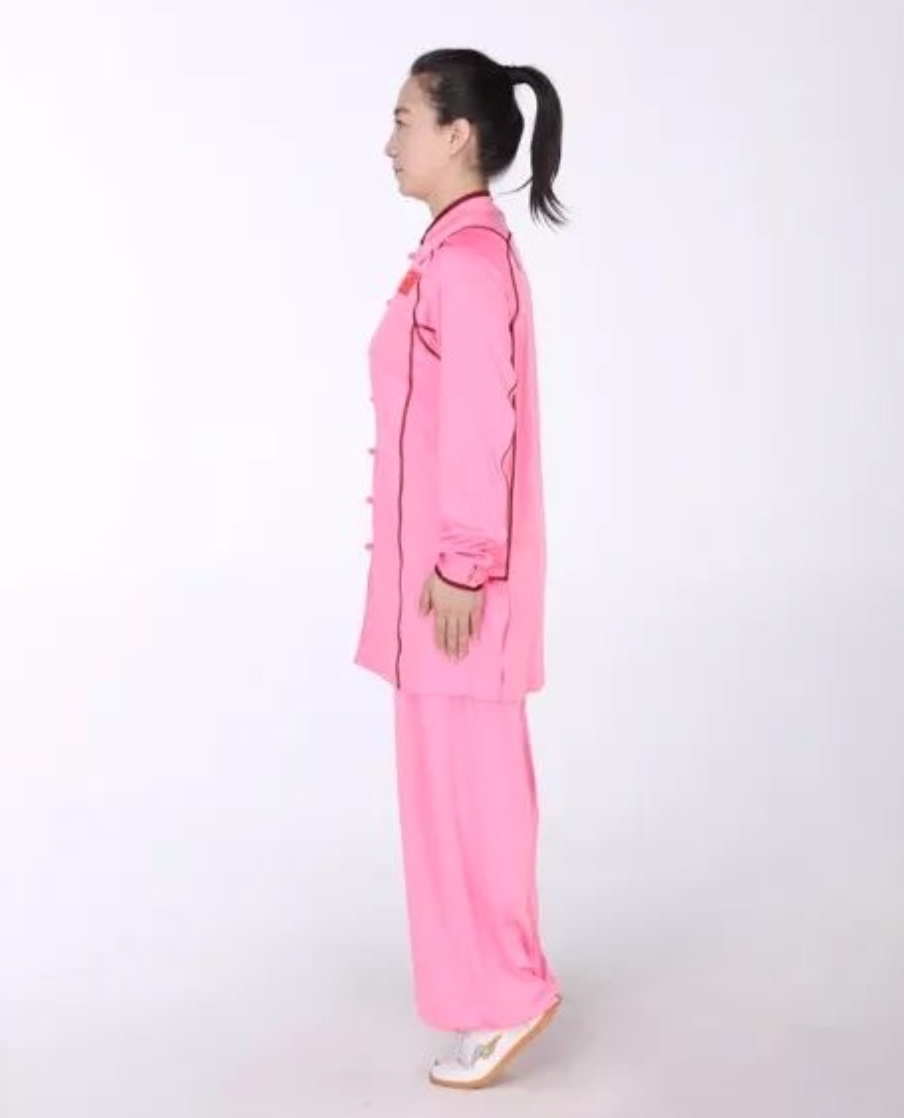 动作要领:直立,并足,两掌紧贴腿侧,两膝伸直,足跟并拢提起,离地数寸,同时昂首,作全身提举势。