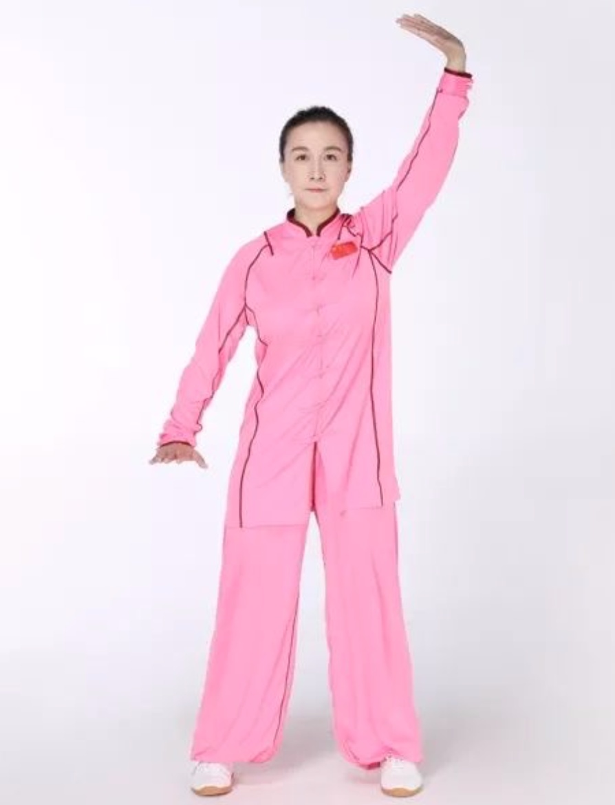 动作要领:直立,两足分开,与肩同宽。右手翻掌上举,五指并紧,掌心向上,指尖向右,同时左手下按,掌心向下,指尖向前。动作复原后,两手交替反复进行,反复多遍,如配合呼吸,则上举下按时吸气,复原时呼气。