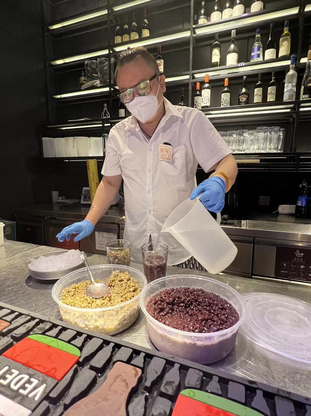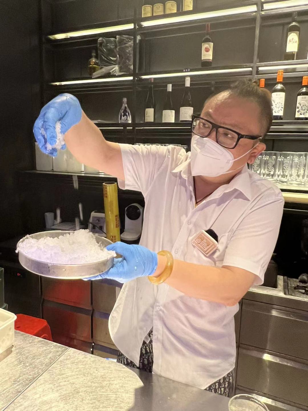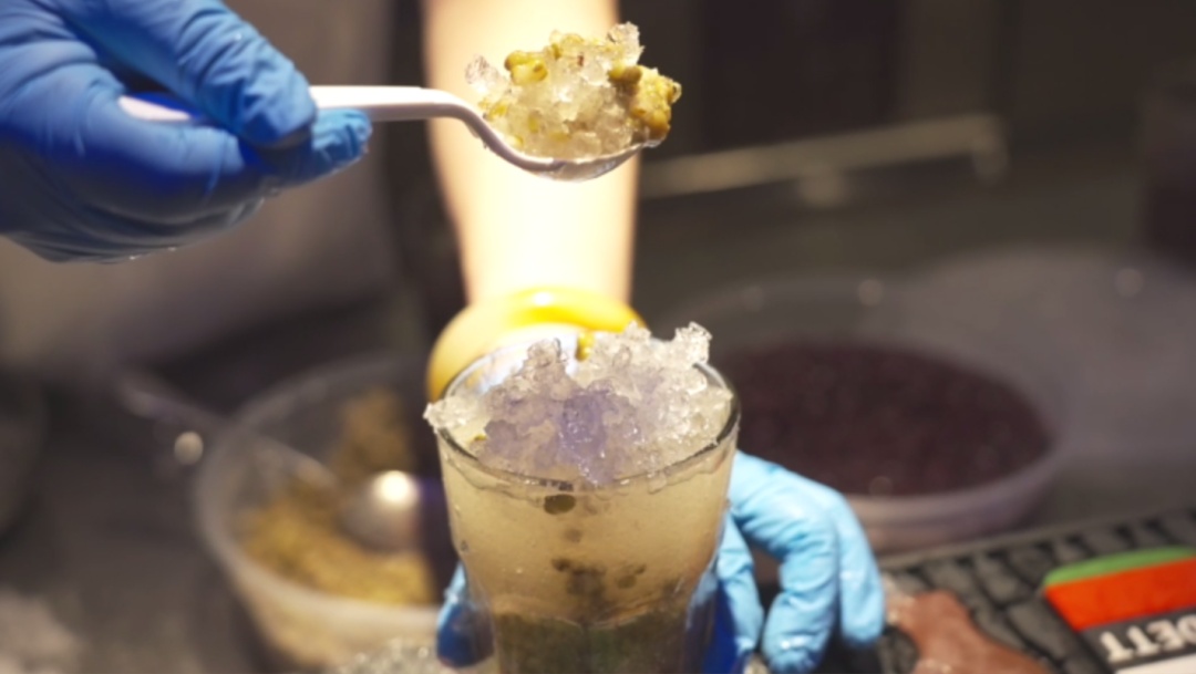 上海老式刨冰没有那么多的花头在里面,只有两个字:实在!在杯底铺上提前焖煮好的绿豆或赤豆,顶上盖一块大大的碎冰渣,而且还得是粗粒子的冰渣,借店长的话来说:粗冰粒子才是老式刨冰的灵魂。