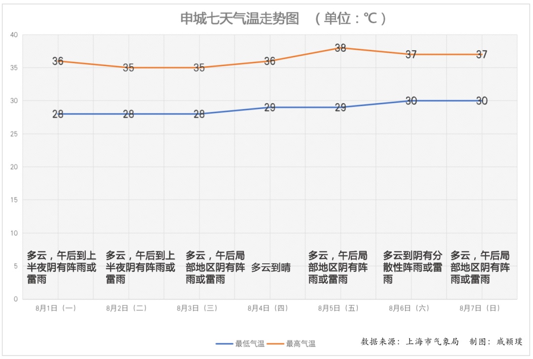 上海中心气象台预报显示,随着副热带高压再度加强西伸,上海本周35℃以上高温日不断档,极端最高温可达38℃。上海今天(1日)的天气和昨天类似,最高温36℃,午后到上半夜有局部阴有阵雨或雷雨。防暑降温用品准备好,因为闷、潮、热的三伏天体感又回来了。